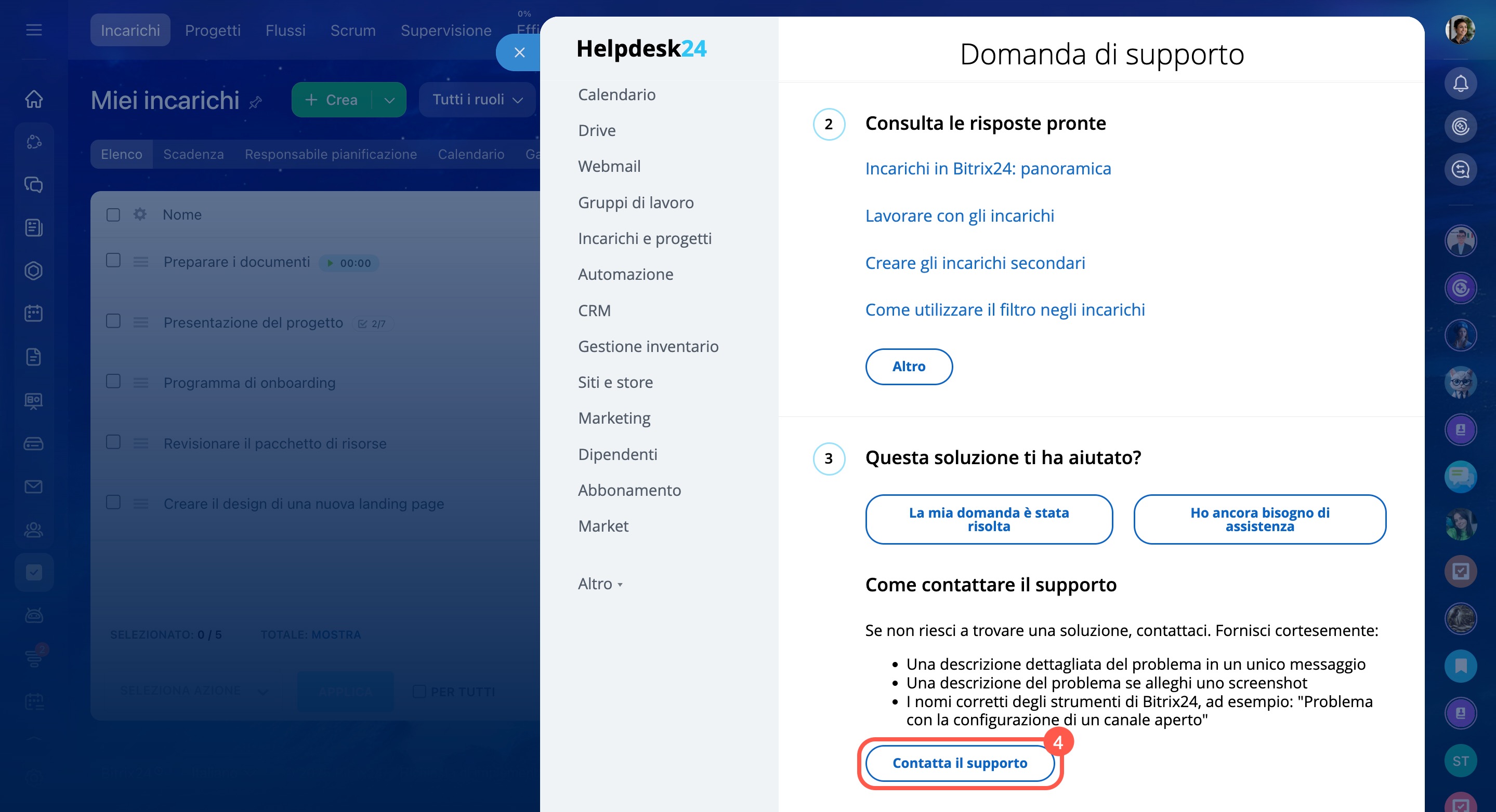 Il supporto di Bitrix24 ti aiuterà a imparare rapidamente come utilizzare Bitrix24 e a trovare le soluzioni in situazioni difficili: