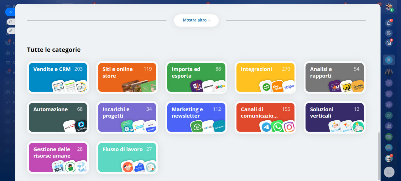 Market è un catalogo di soluzioni preconfigurate che ottimizzano l'ambito funzionale degli strumenti Bitrix24.Le applicazioni di Market includono i modelli della pagina di destinazione personalizzati, le integrazioni con gli strumenti di terze parti e varie soluzioni per telefonia, servizi bancari, sistemi di pagamento e chatbot.