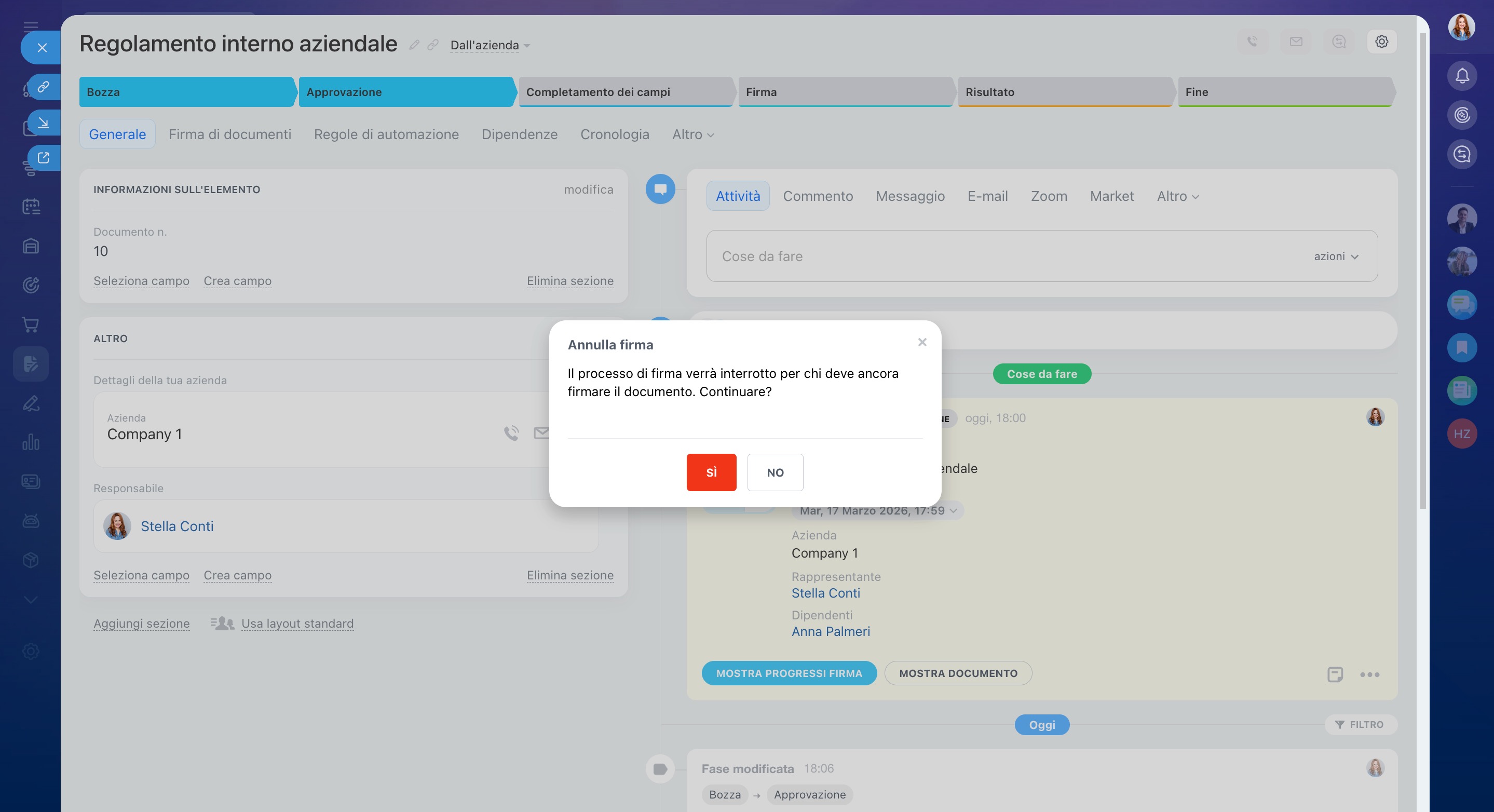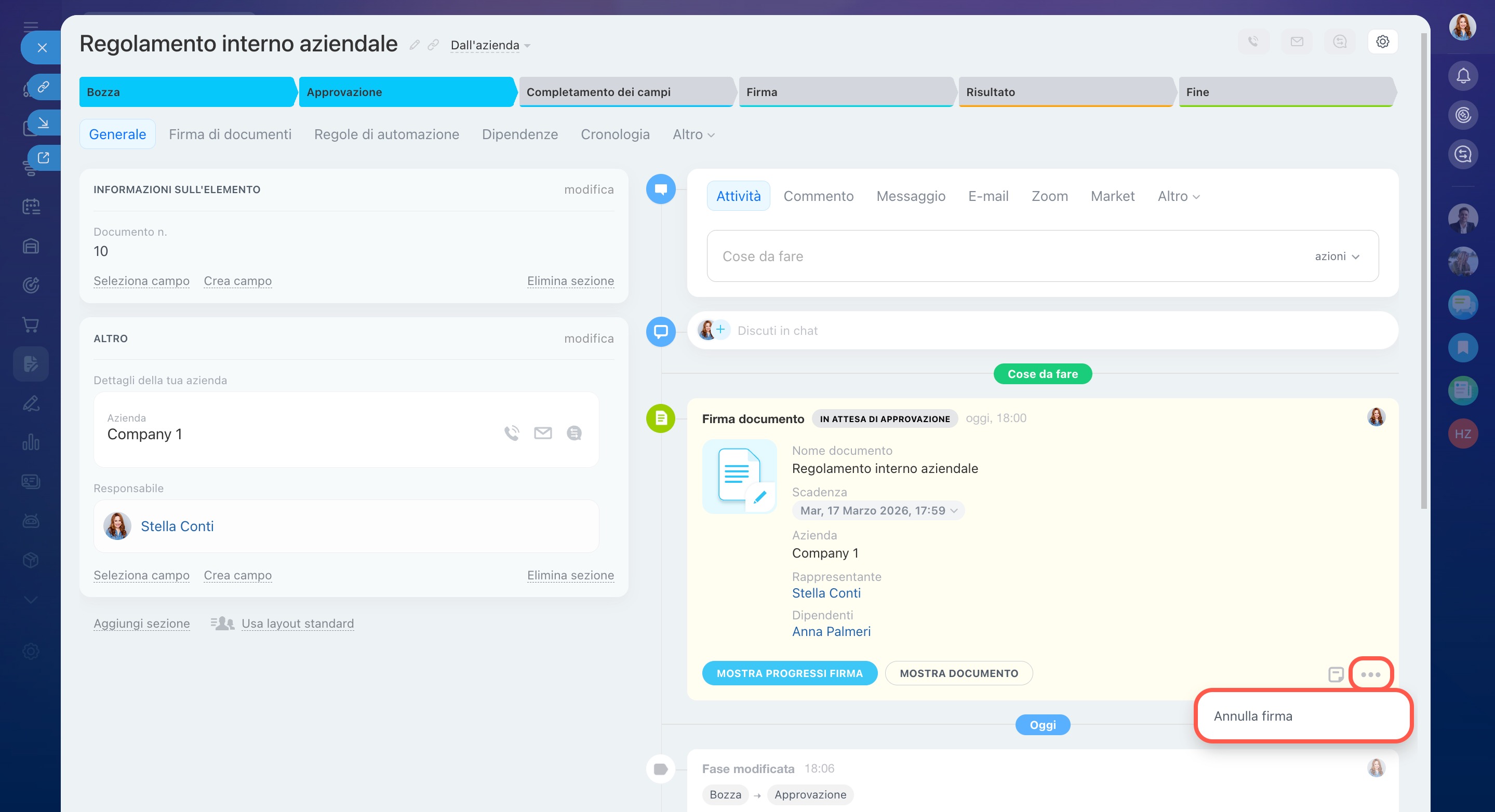 La firma di un documento può essere annullata nella scheda di questo documento. Apri la scheda del documento > cerca l'attività Firma documento nella timeline > fai clic su Annulla firma.