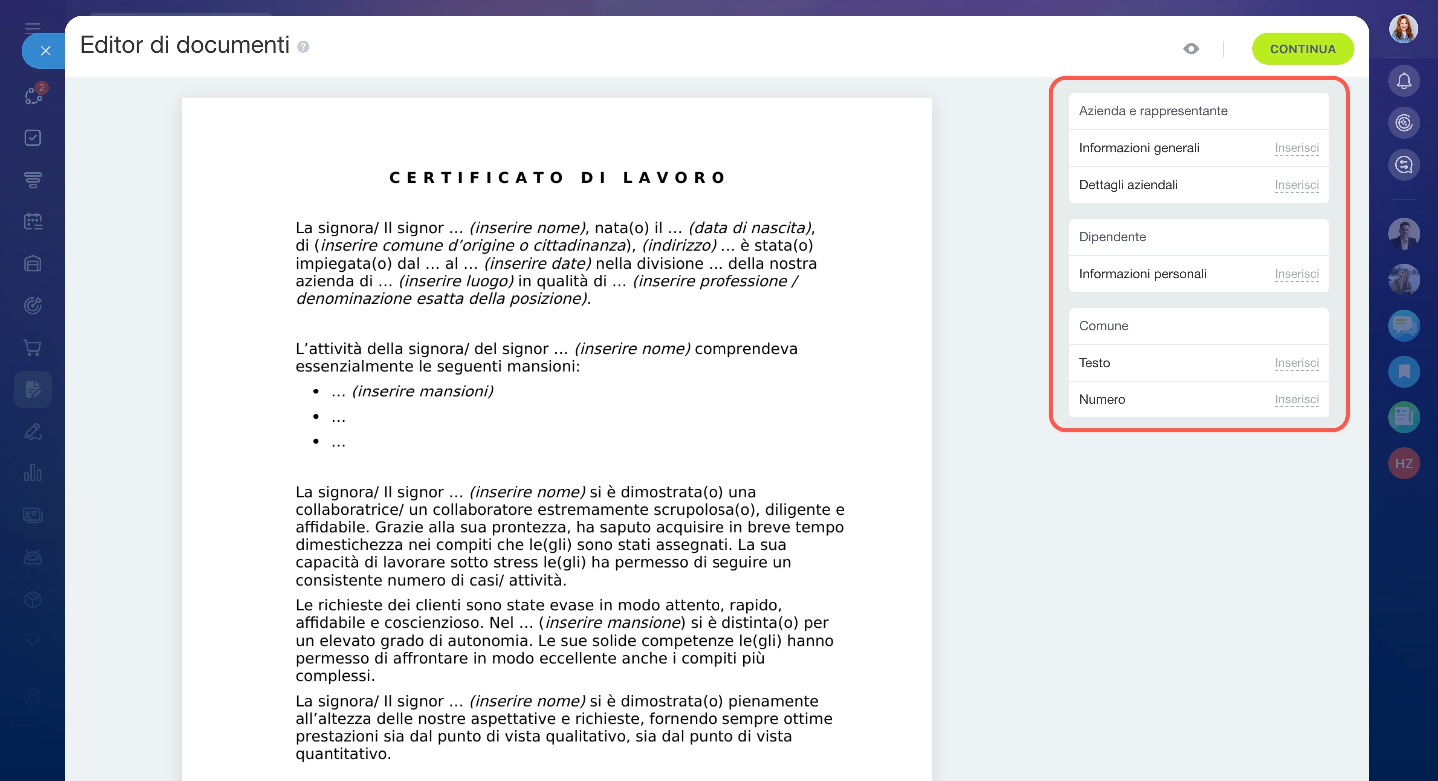 - Per modificare un documento, fai clic su Modifica e utilizza i blocchi a destra: Azienda e rappresentante, Dipendente e Comune.