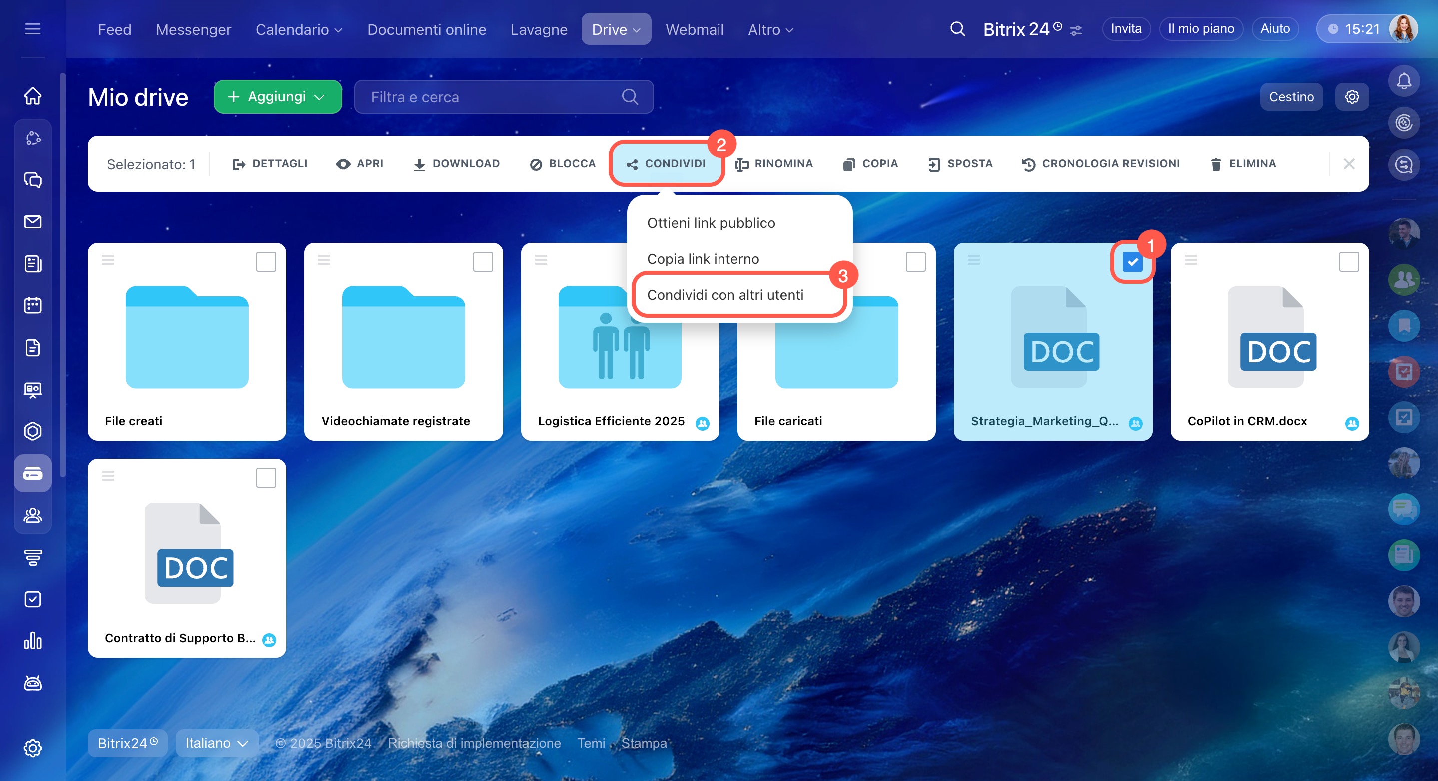 • In Bitrix24 Drive puoi lavorare con documenti di testo, fogli di calcolo e presentazioni. Ogni utente di Bitrix24 può scegliere il modo di lavorare con i documenti: localmente, nel cloud o Bitrix24.