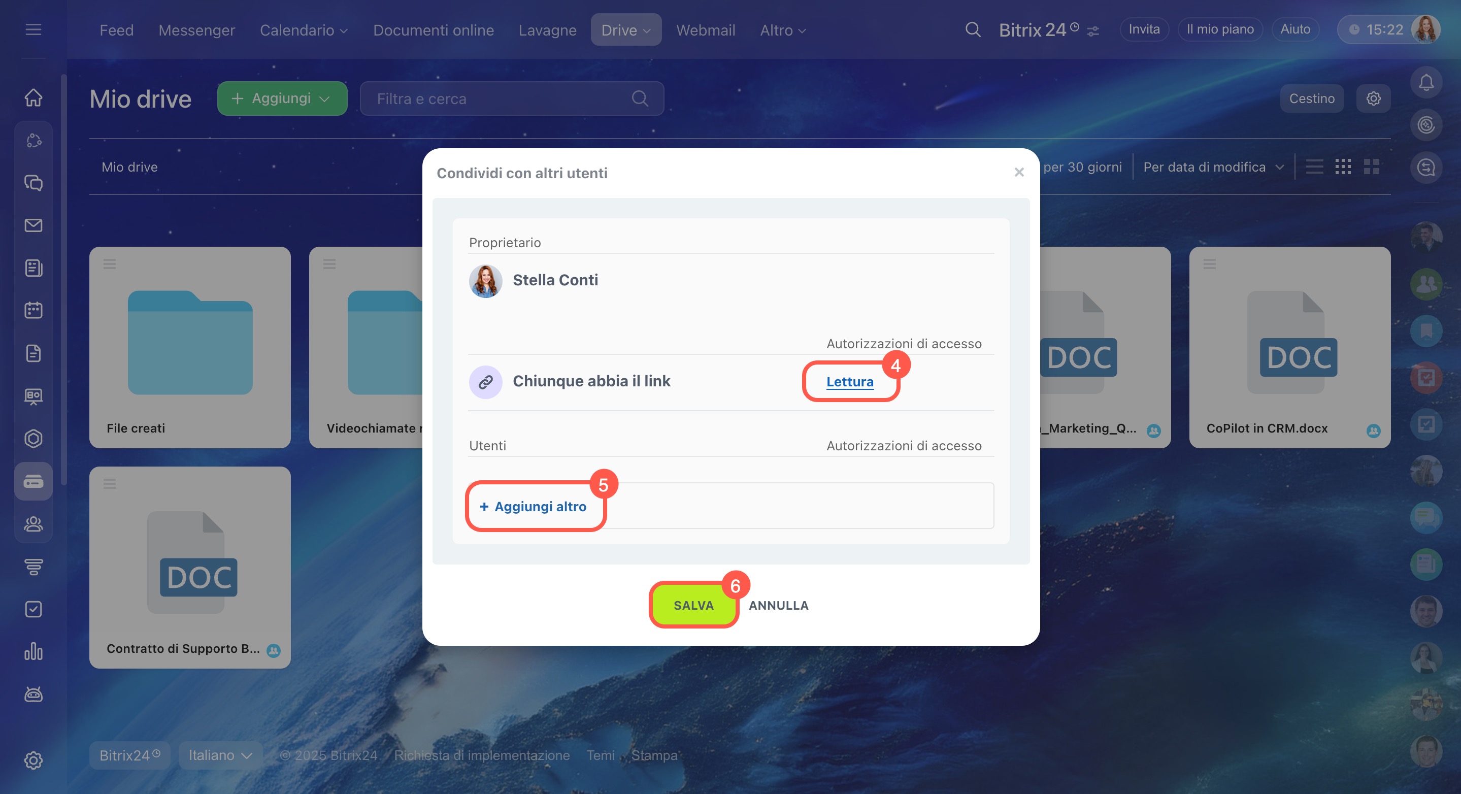 In Bitrix24 è possibile collaborare su un documento con colleghi o utenti esterni. Per mantenere il controllo delle informazioni, configura diversi livelli di accesso per i partecipanti. Ad esempio, consenti ai dipendenti di modificare i documenti e ai clienti o esperti esterni di visualizzarli.