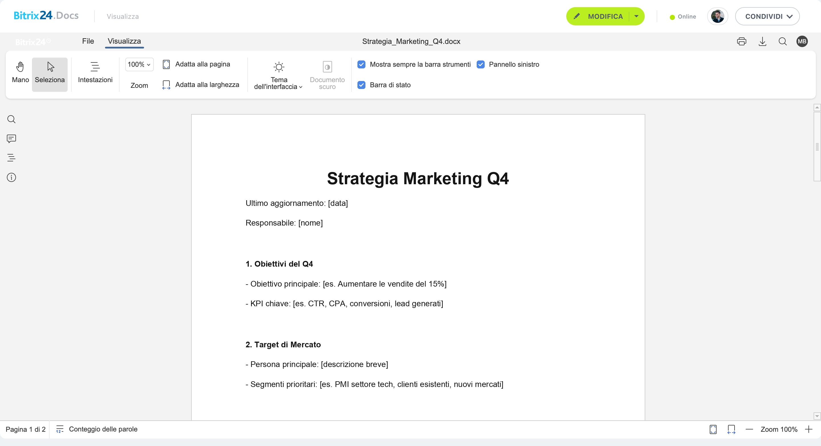 • Bitrix24 - è un editor online integrato per lavorare con i documenti. Potrai creare, modificare e condividere i documenti con i tuoi colleghi direttamente in Bitrix24.