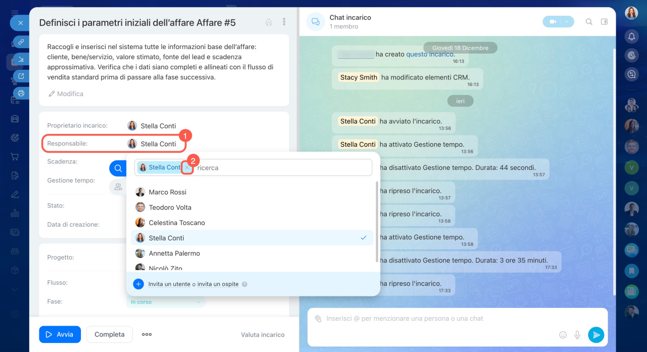 - Puoi cambiare il responsabile nella scheda degli incarichi o nell'elenco degli incarichi.