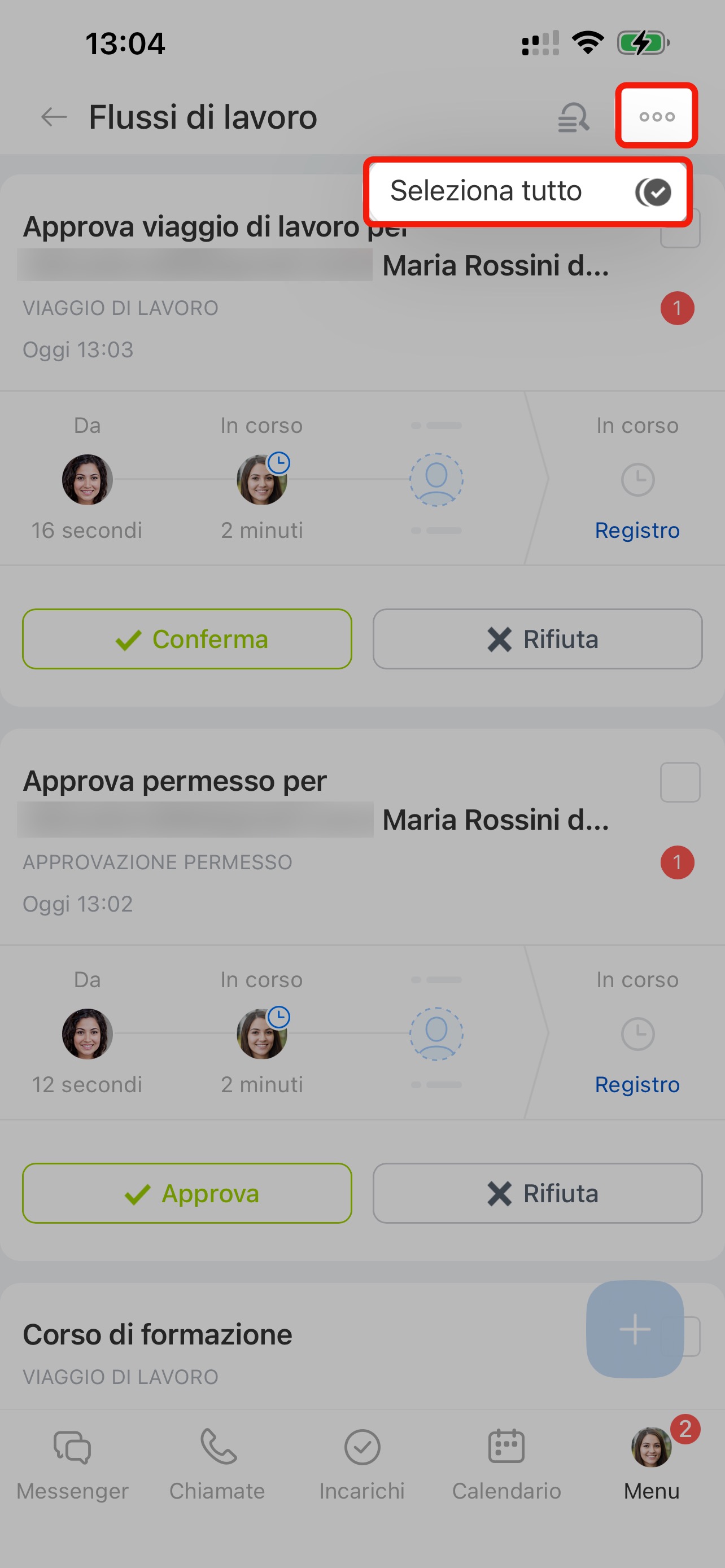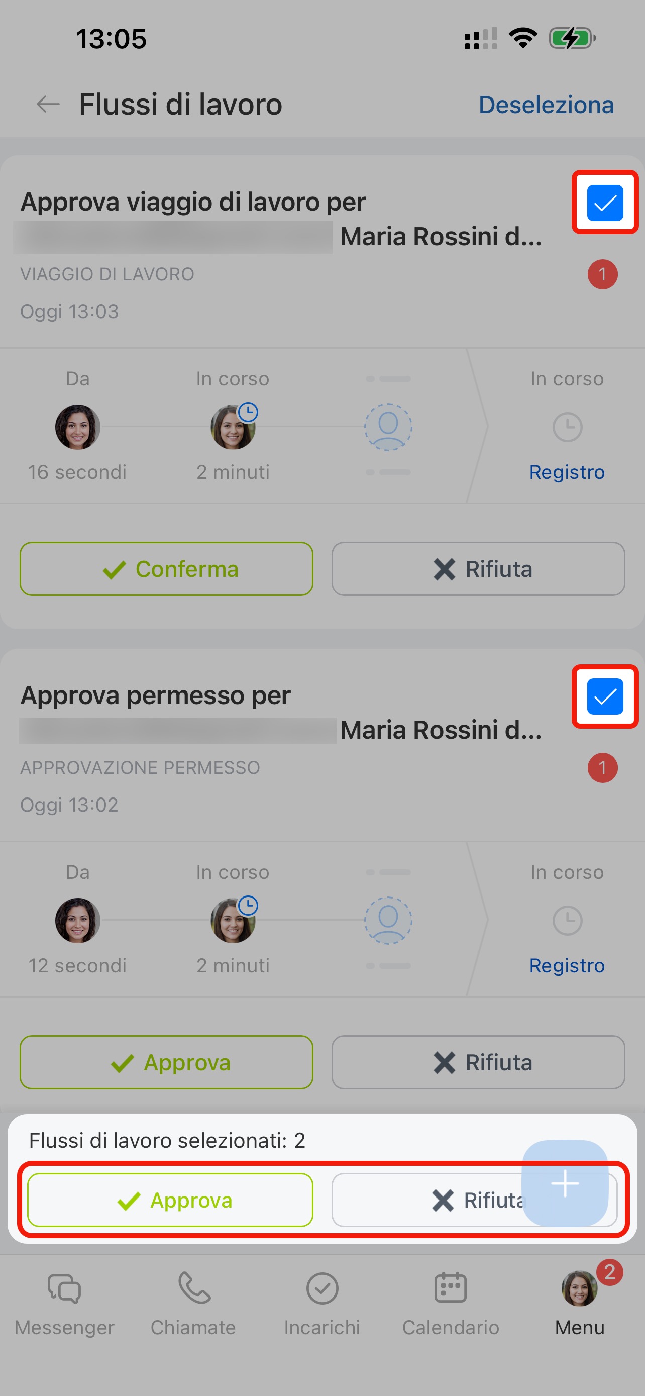Flussi di lavoro: un unico tipo. Se selezioni i processi che necessitano di essere rivisti o approvati, puoi completare gli incarichi su tutti i processi contemporaneamente. Ad esempio, puoi approvare tutte le richieste di ferie o rivedere tutti gli ordini.
