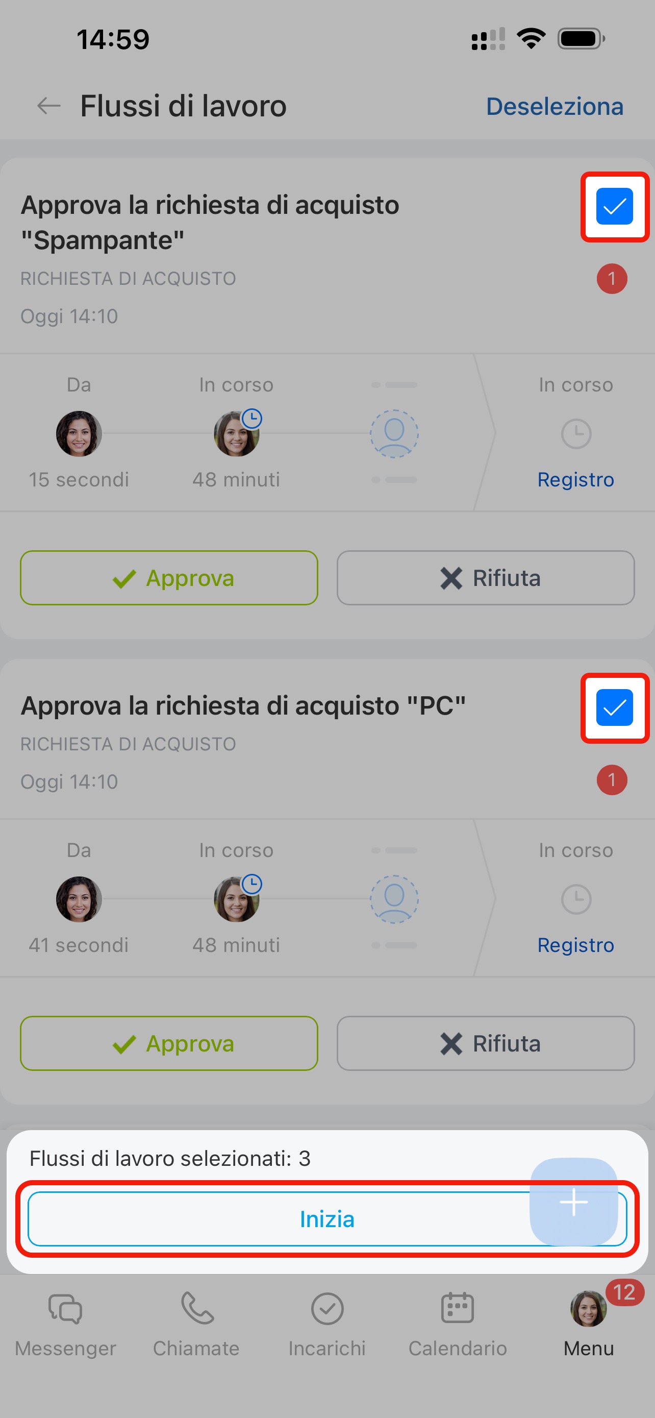 Nell'app mobile di Bitrix24, puoi lavorare su più flussi di lavoro contemporaneamente. Non è più necessario approvare ogni processo separatamente. Ad esempio, un responsabile può approvare immediatamente tutte le richieste di viaggio o concordare termini di pagamento delle fatture.