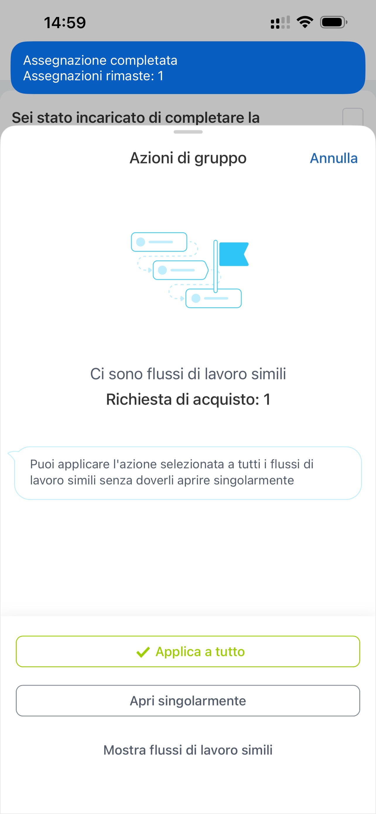 Dopo aver completato un incarico in un flusso di lavoro, vedrai altri flussi che richiedono lo stesso incarico. Ad esempio, dopo aver approvato una richiesta di acquisto, scoprirai quante altre richieste devono essere approvate.