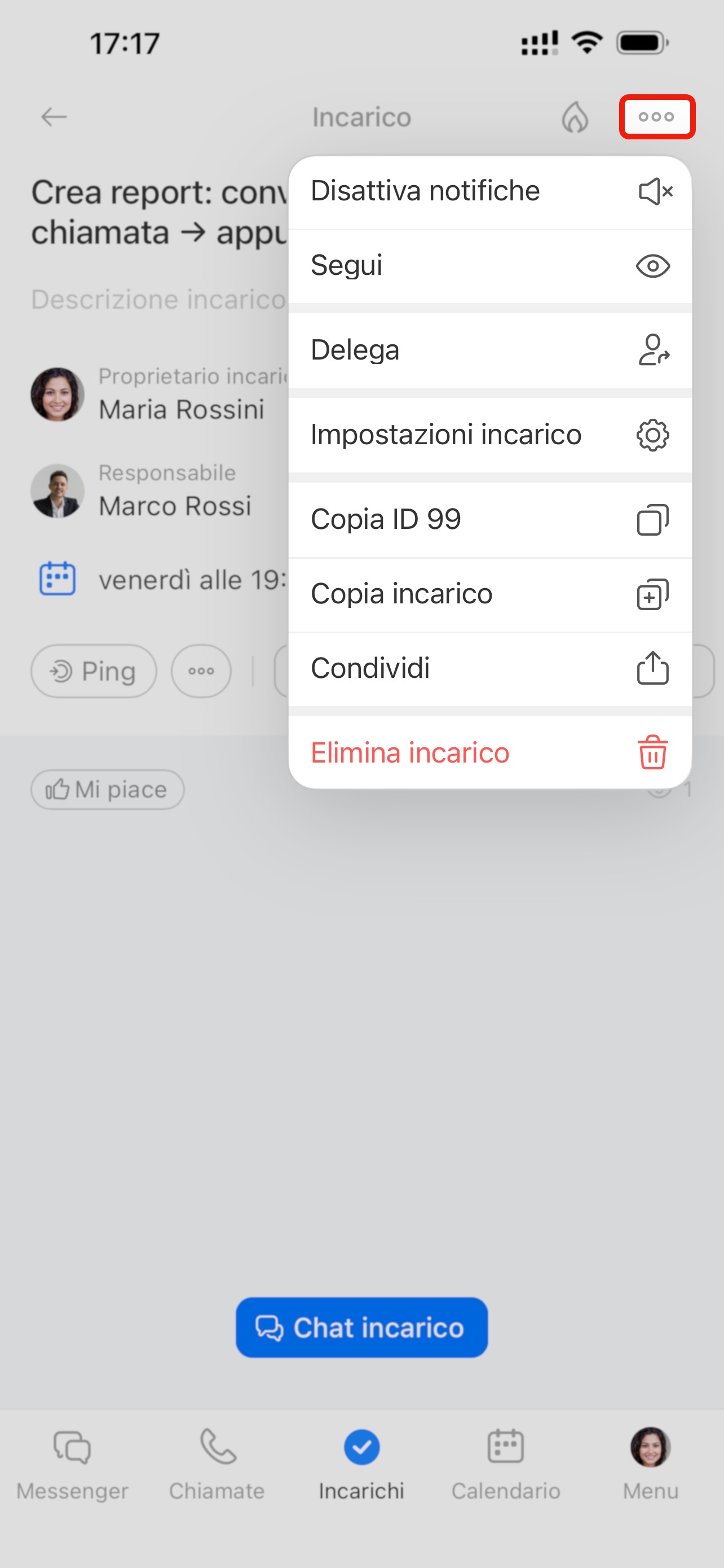 Fai clic su Tre punti (...) per aprire il menu delle azioni dell'incarico o eliminarlo.