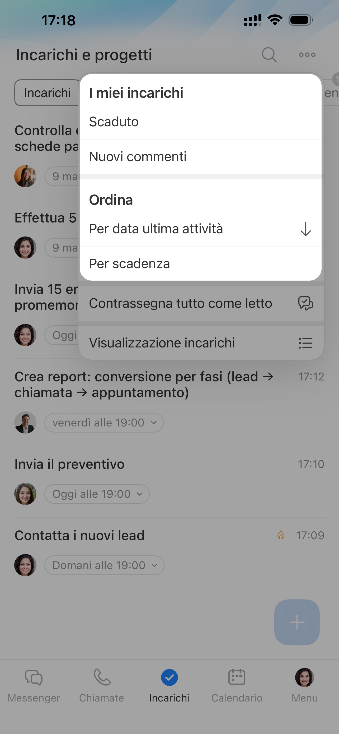 Ordina gli incarichi per attività, data di scadenza o nuovi commenti.