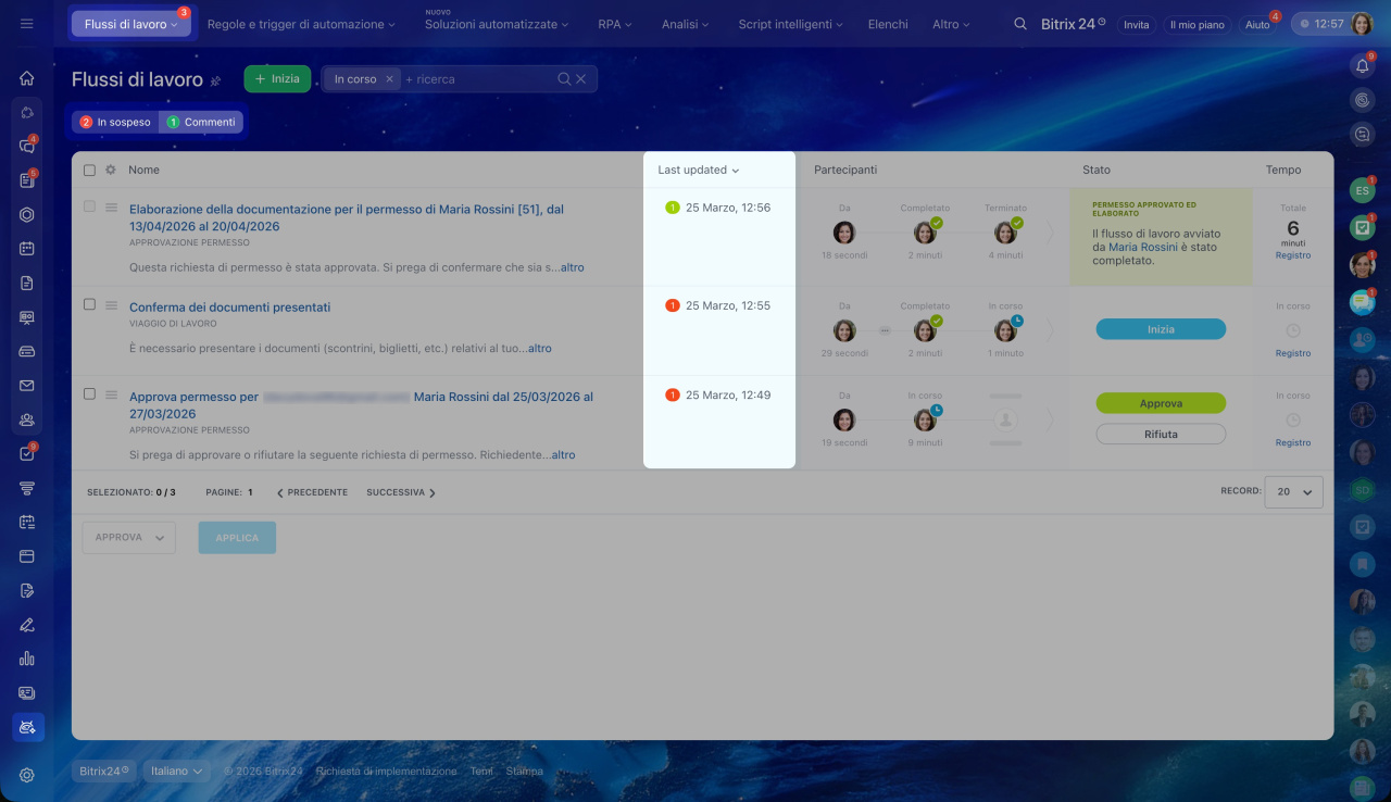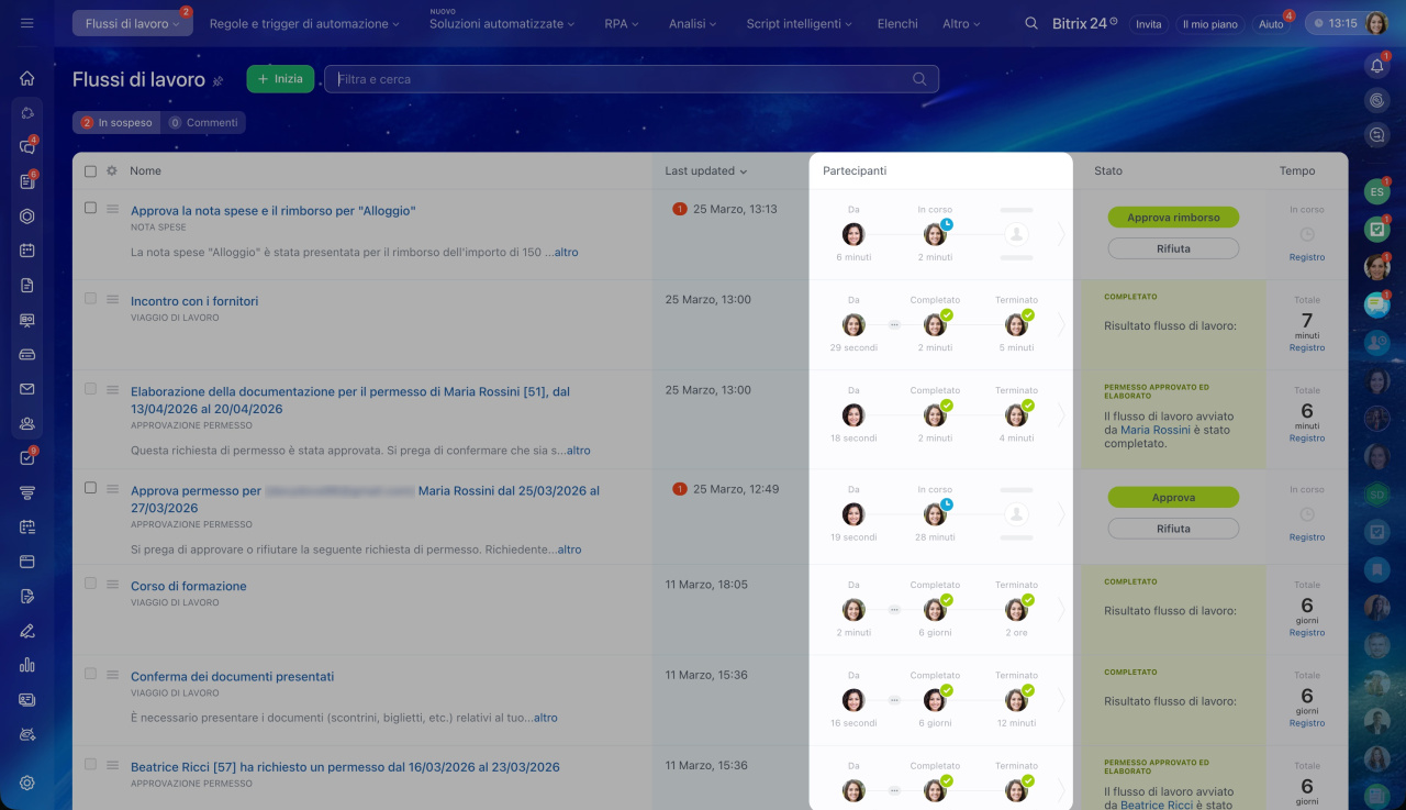 L'elenco contiene informazioni chiave relative sui flussi di lavoro: data dell'ultima attività, dipendenti che approvano il processo, stato e tempo di esecuzione.