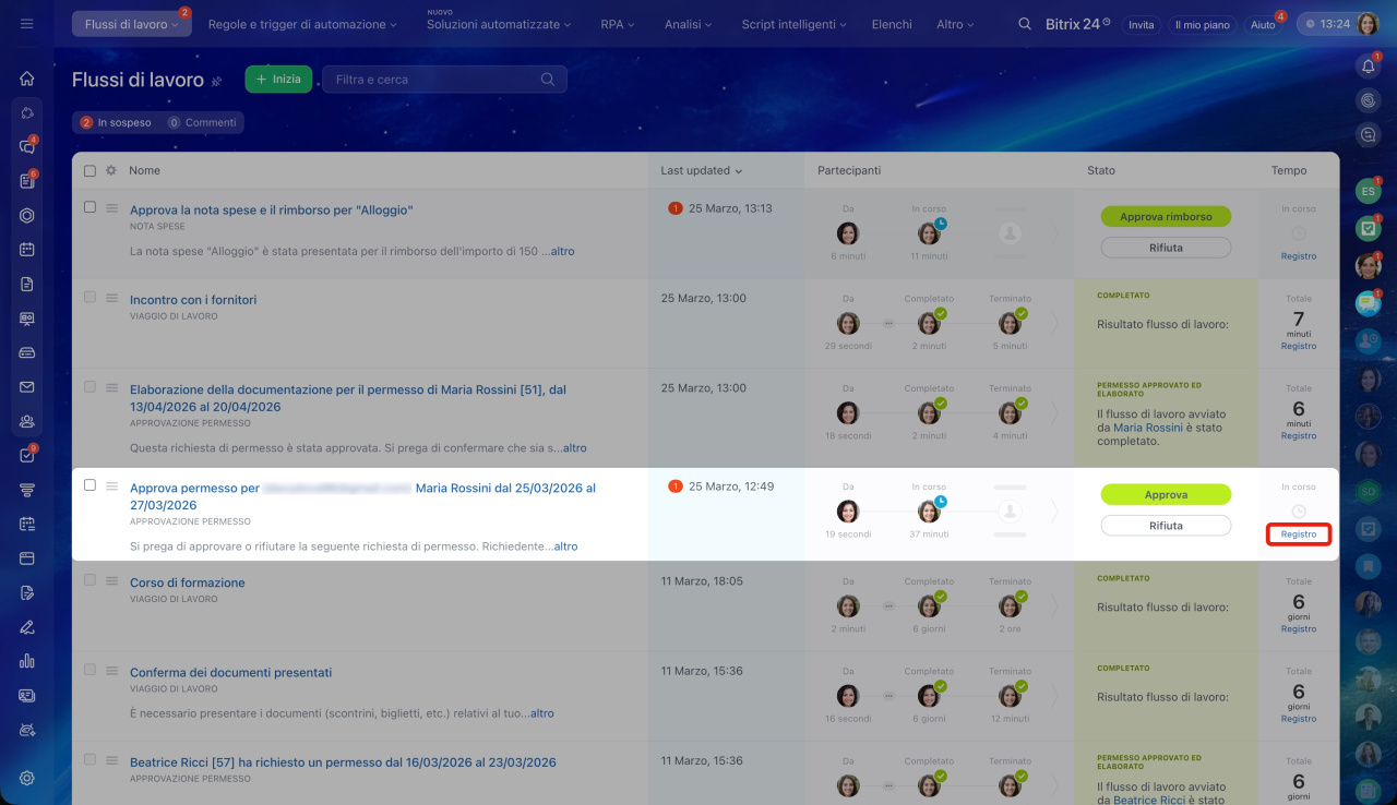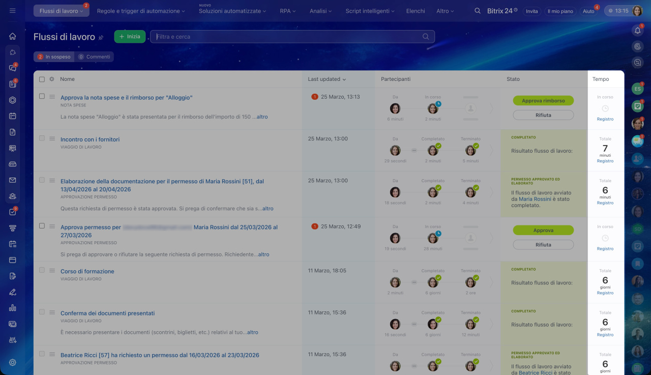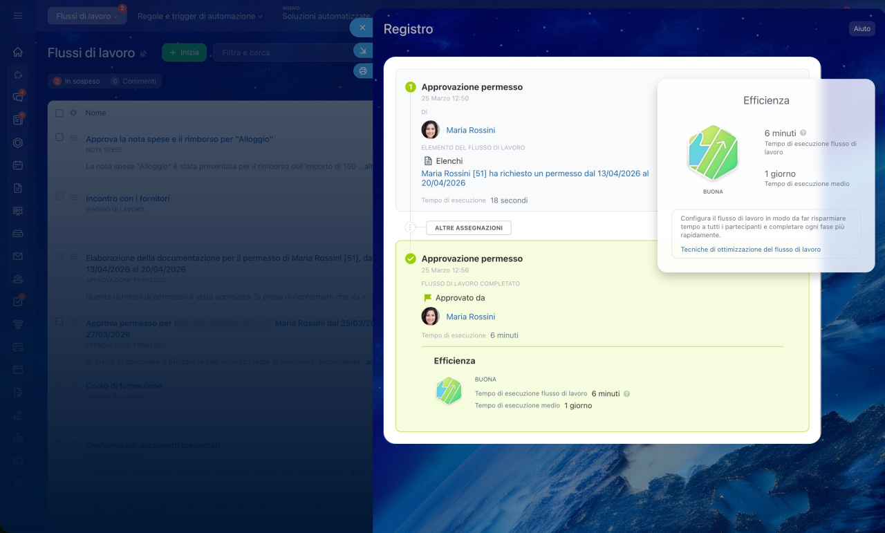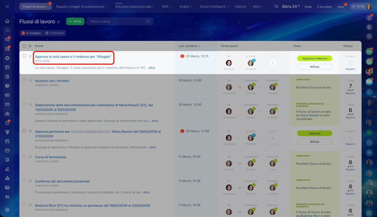 - Nell’elenco dei flussi di lavoro è possibile visualizzare le informazioni principali: data dell’ultima attività, dipendenti che approvano il processo, stato e tempo di esecuzione. Nel registro vengono salvate tutte le azioni, i partecipanti al processo e l’efficienza del processo: il tempo medio di esecuzione per l’azienda e il tempo impiegato per questo processo.