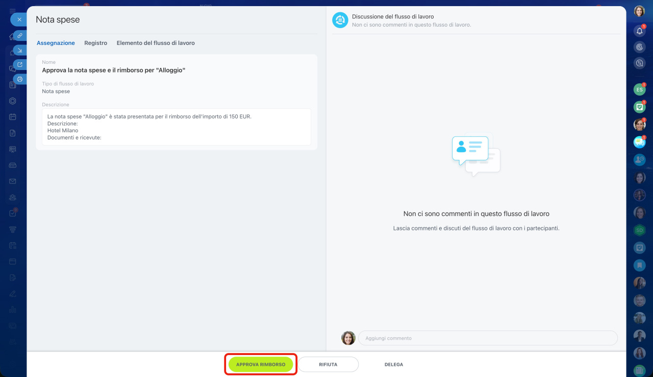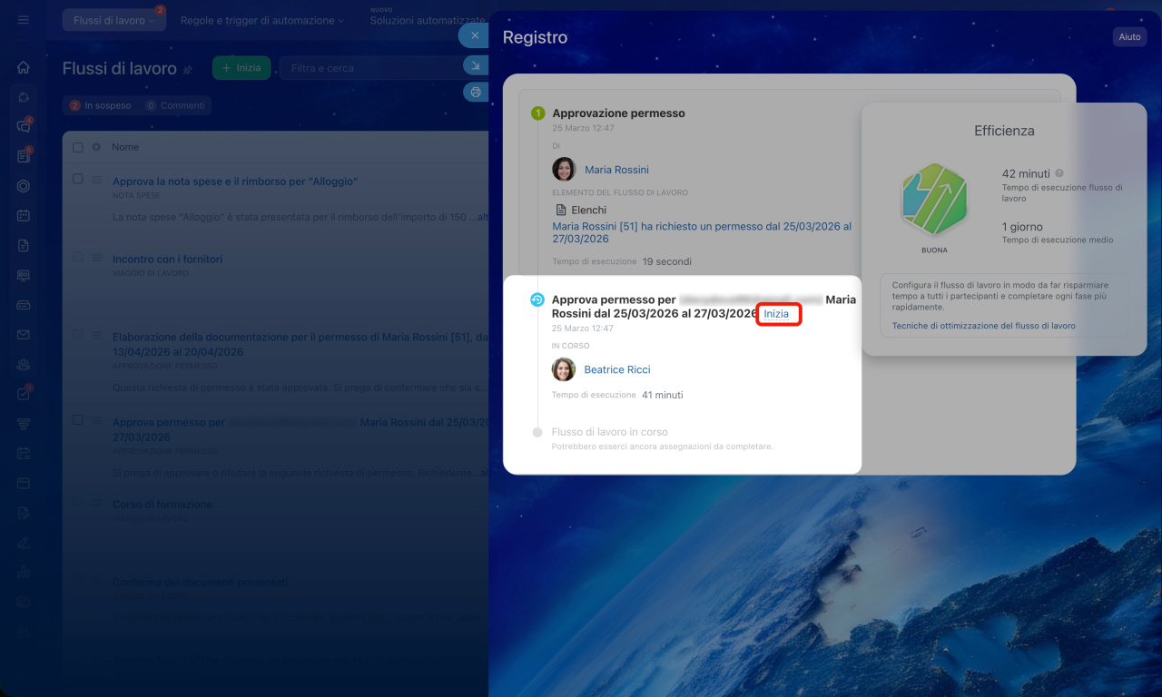 Il registro mostra tutte le azioni, i partecipanti e l'efficienza del flusso di lavoro. Ci sono diversi indicatori di efficienza: