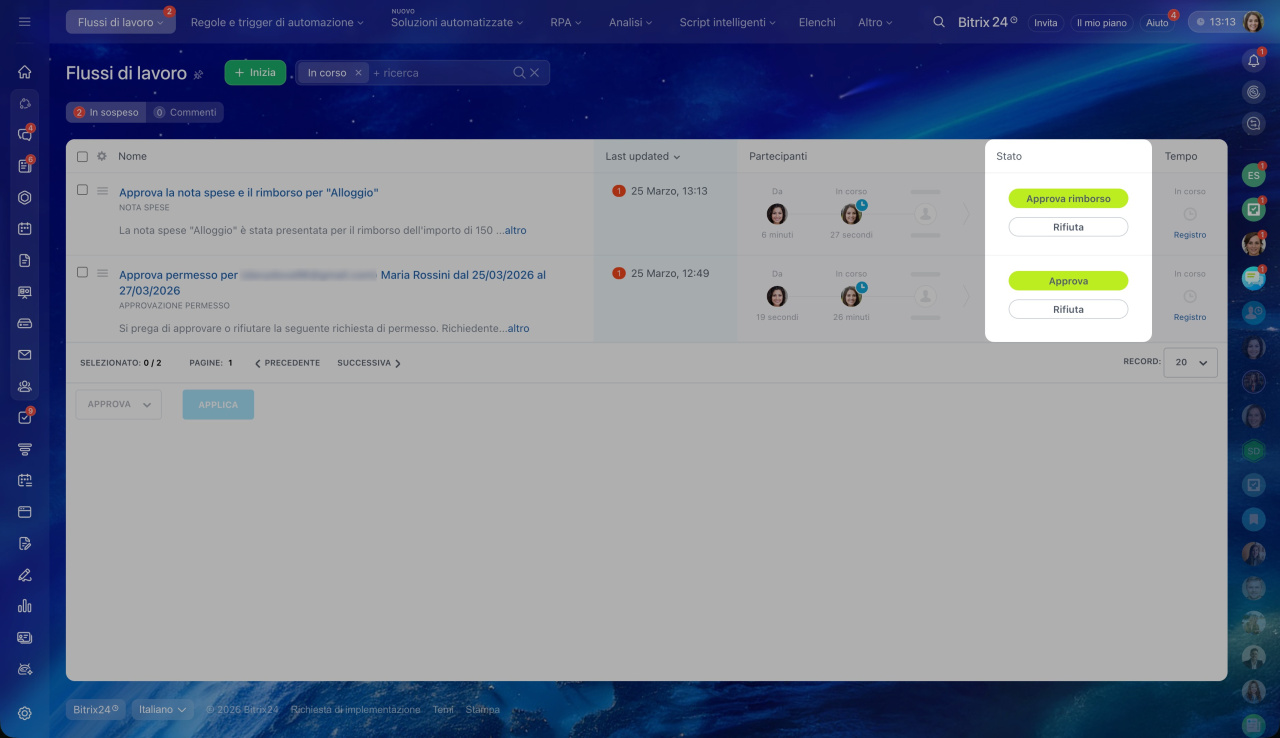 Stato. Questa colonna contiene i pulsanti per eseguire il flusso di lavoro. Se il processo è già stato rifiutato, rinviato o terminato, ne verrà visualizzato lo stato.
