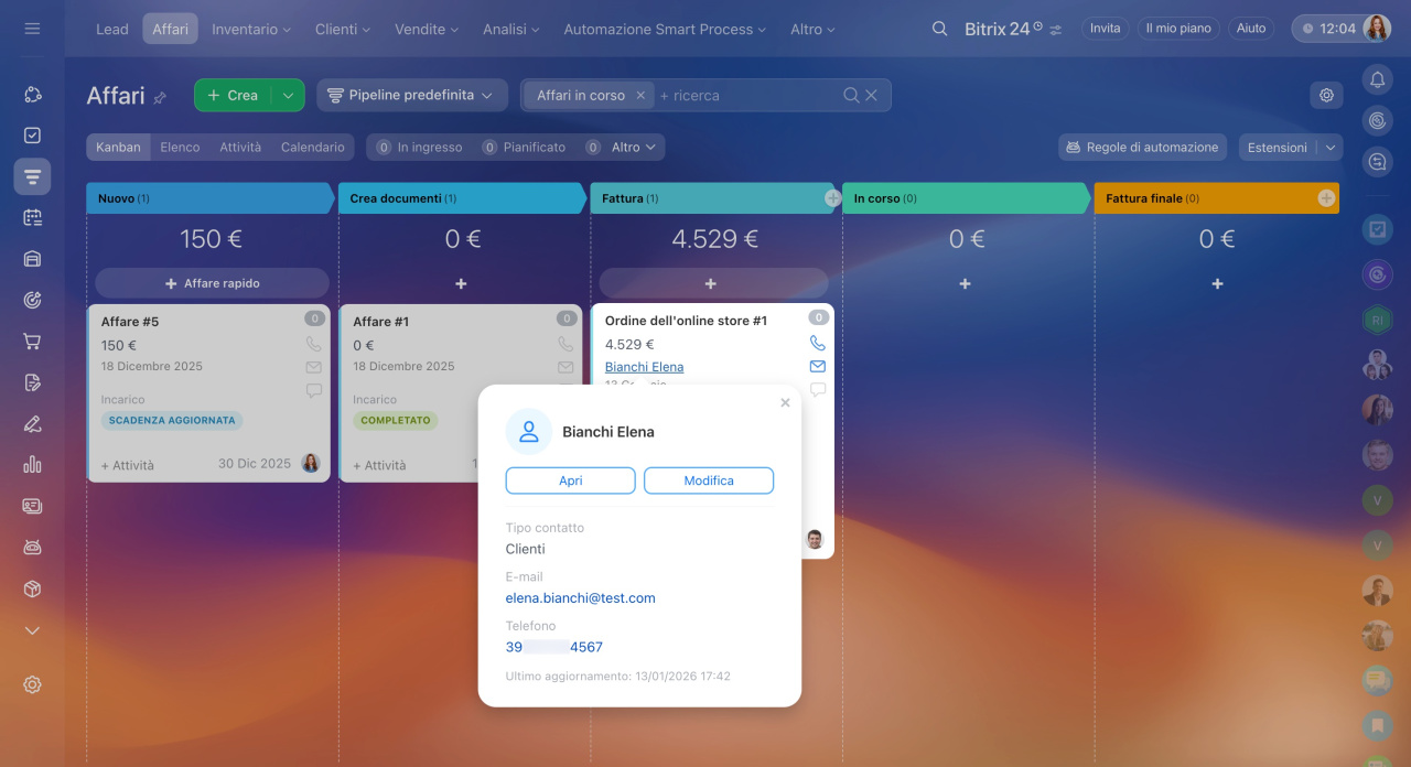 Contattare il cliente. Per visualizzare rapidamente i contatti, inviare un messaggio o effettuare una chiamata, passa il cursore sul nome del cliente. Si aprirà una mini scheda CRM con le informazioni principali, come tipo di cliente, azienda, numero di telefono ed e-mail. Da qui puoi aprire la scheda completa del cliente e modificare i dati, se necessario.