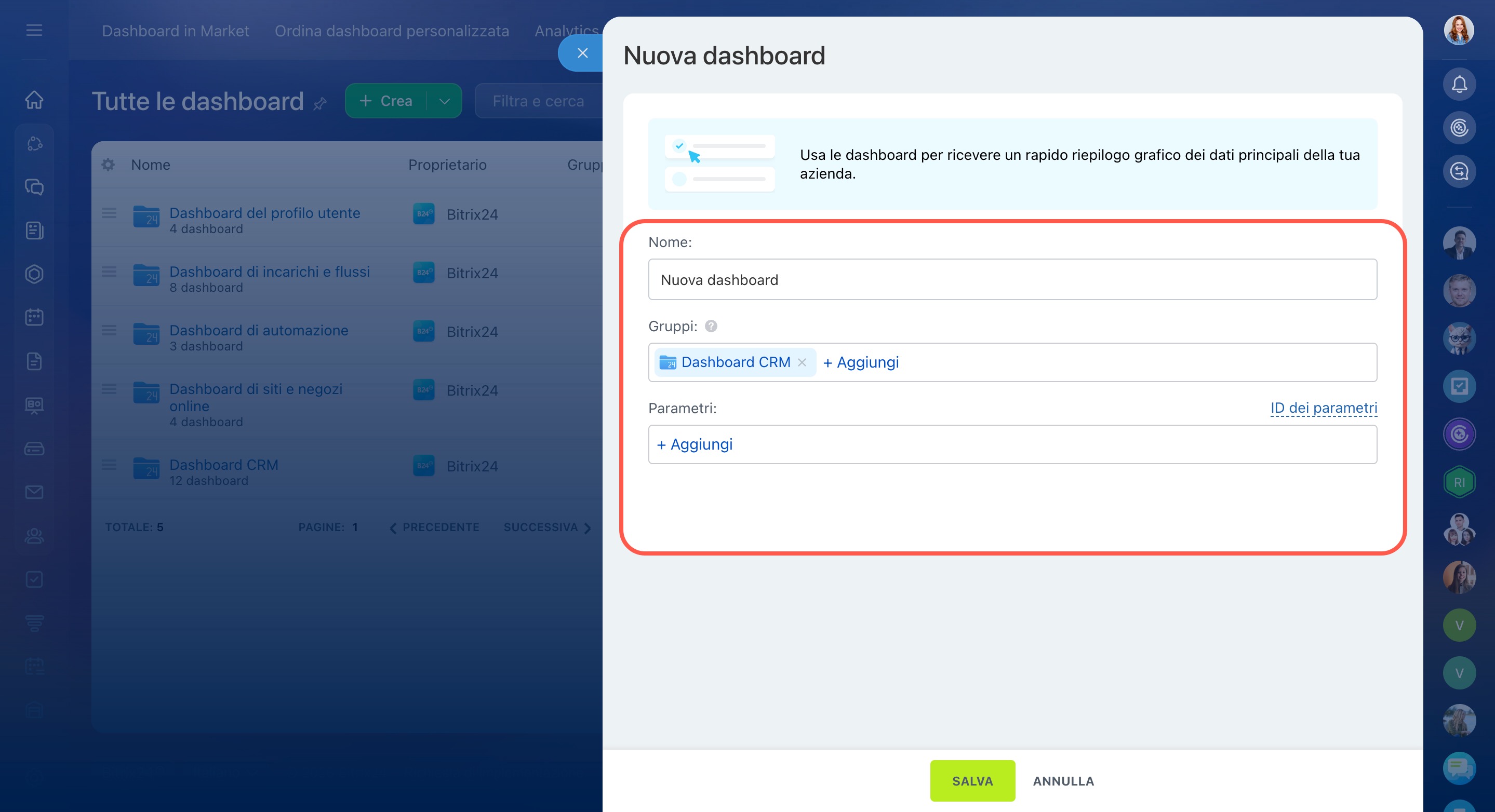 Quando crei una dashboard, inserisci il suo nome, aggiungila ai gruppi e seleziona i parametri da usare.