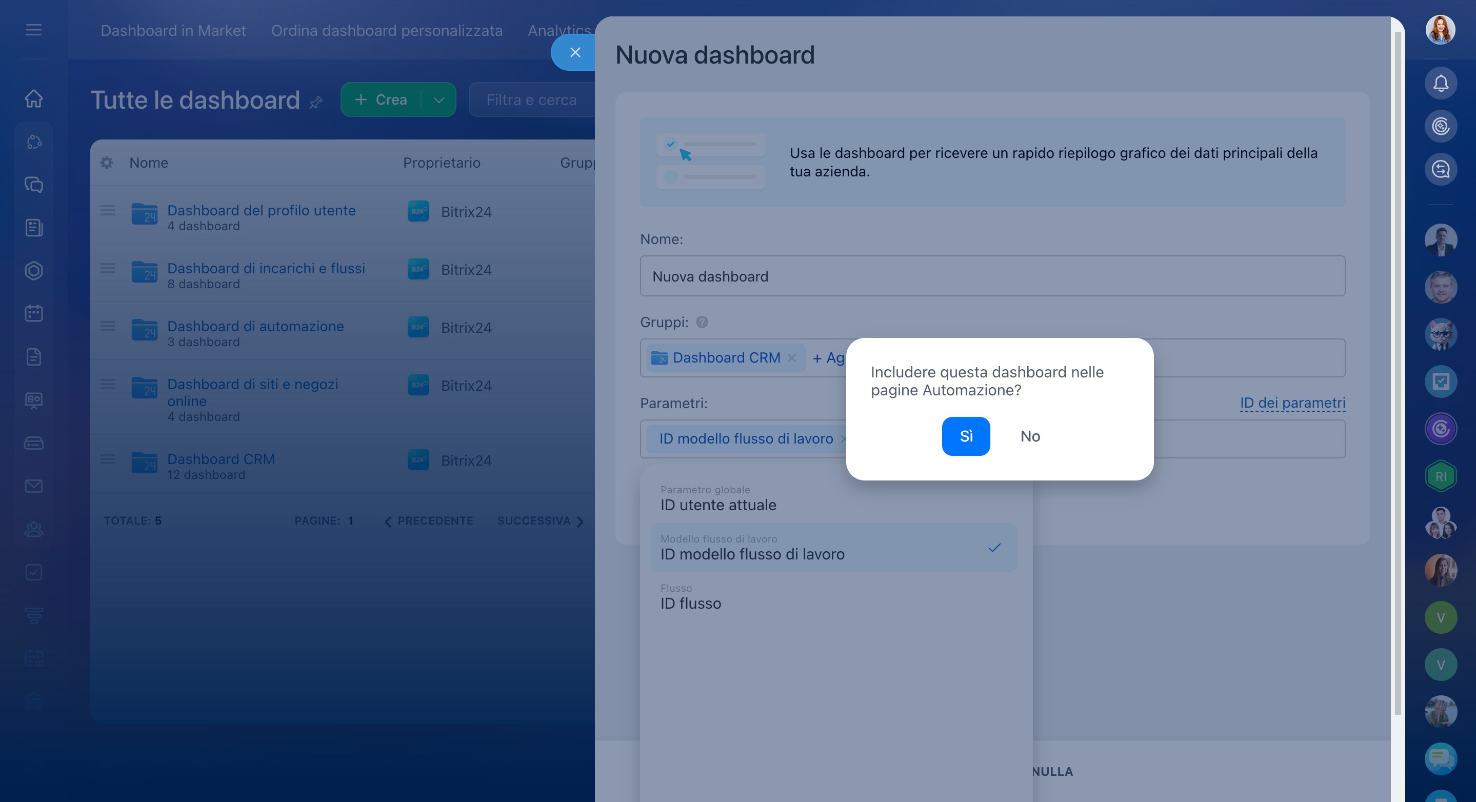 - Configura i parametri e seleziona i gruppi per le dashboard nuove ed esistenti.
