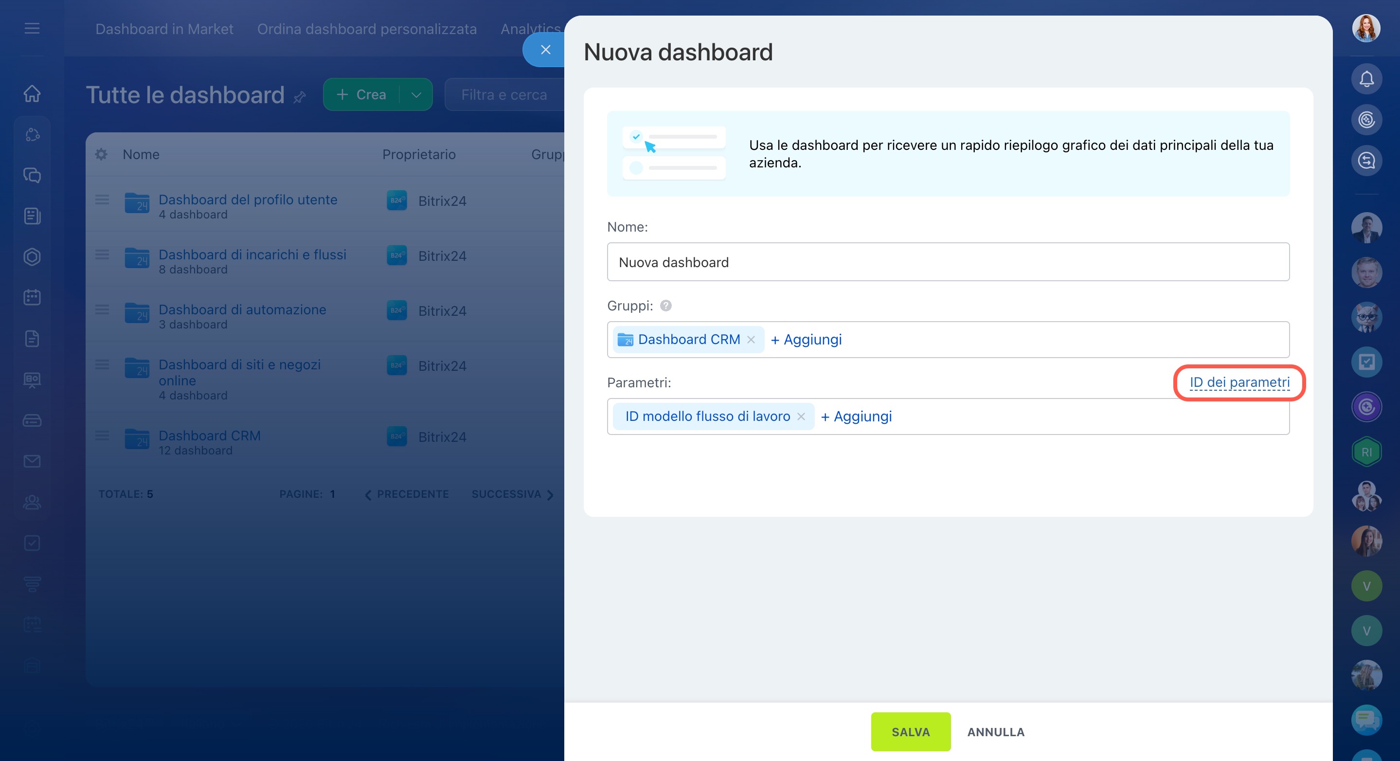 Configura i parametri della dashboard