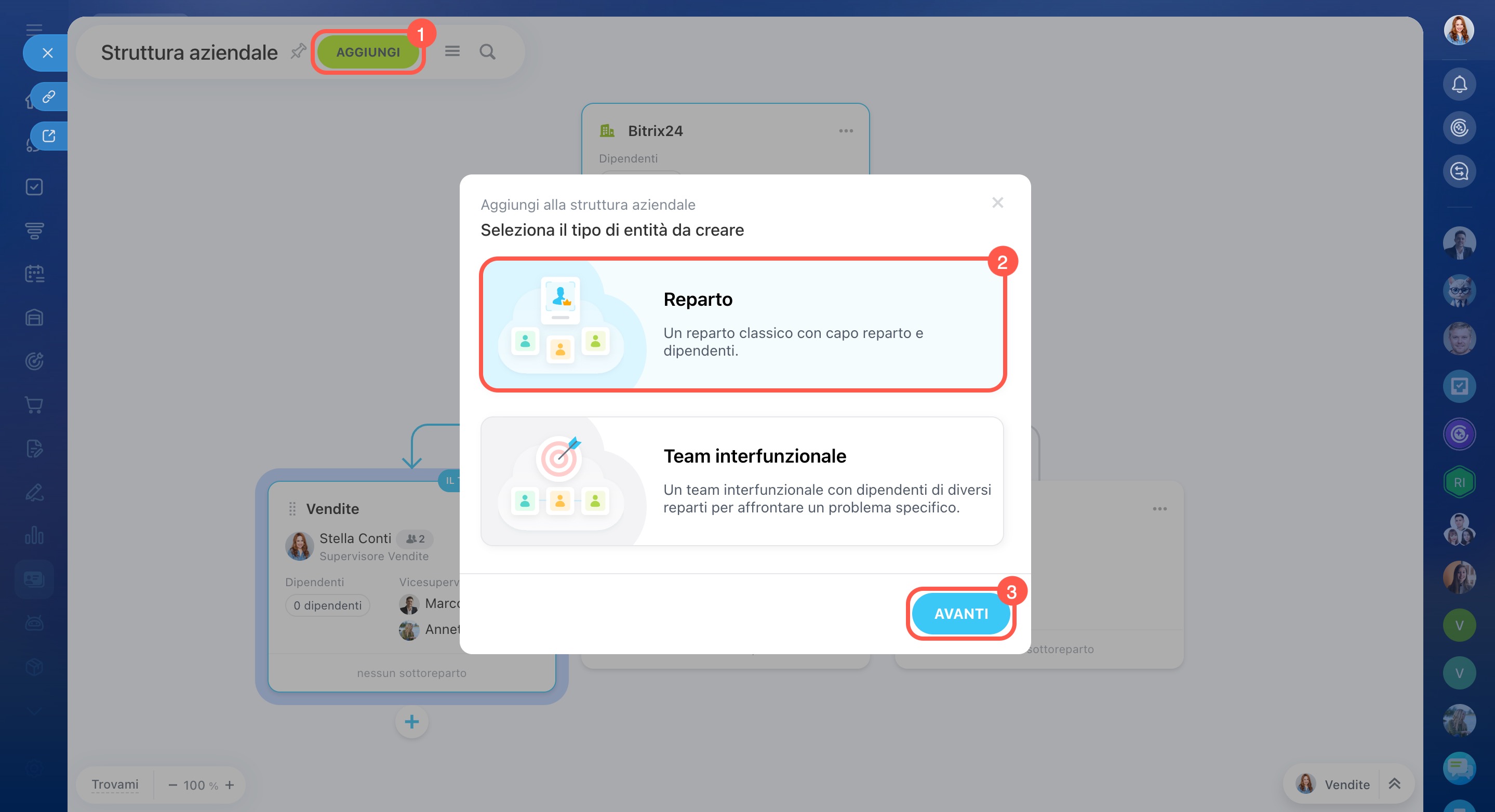 - Nella struttura puoi creare, modificare ed eliminare reparti, cambiare supervisori e trasferire dipendenti, tra le altre azioni.