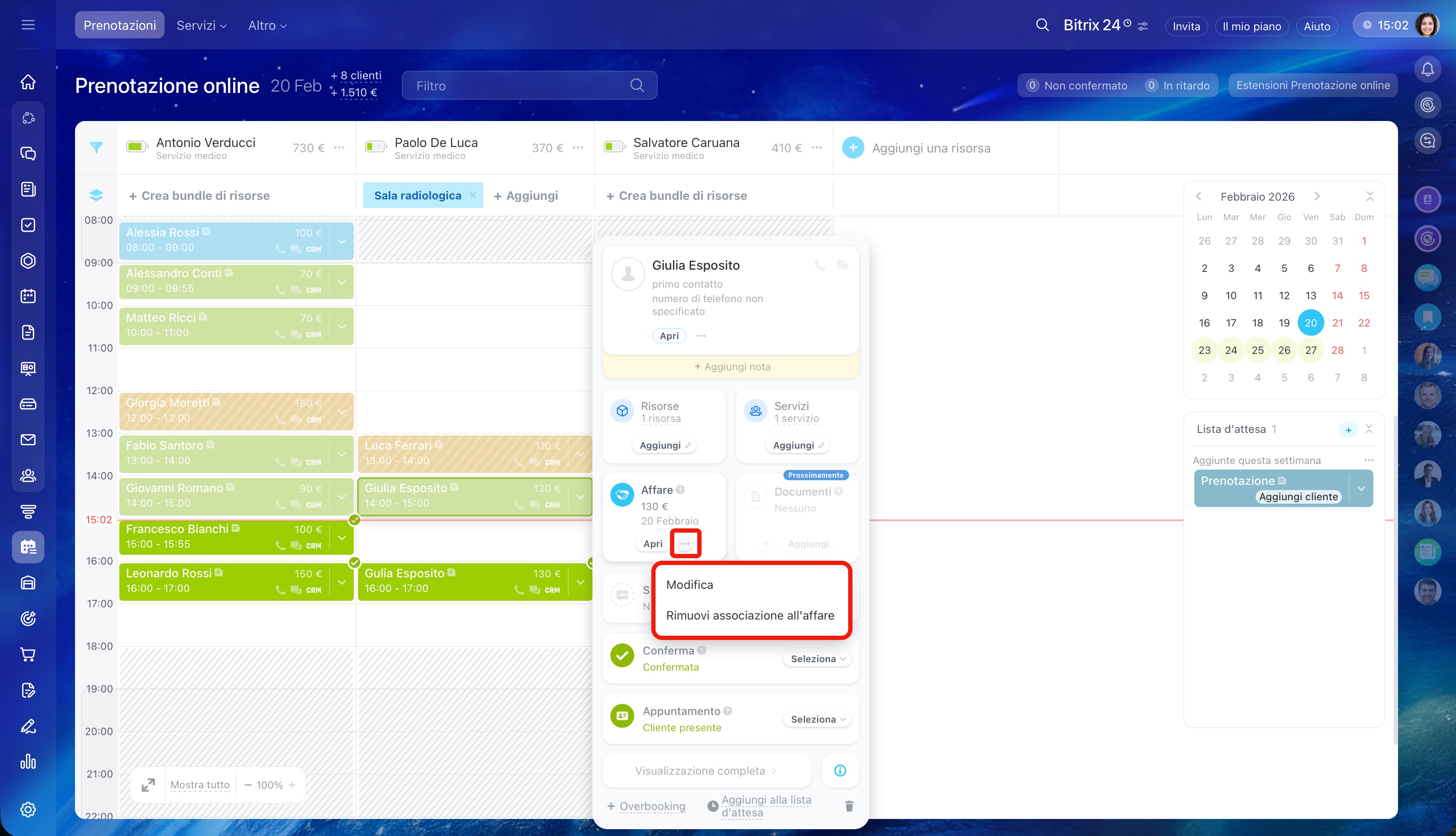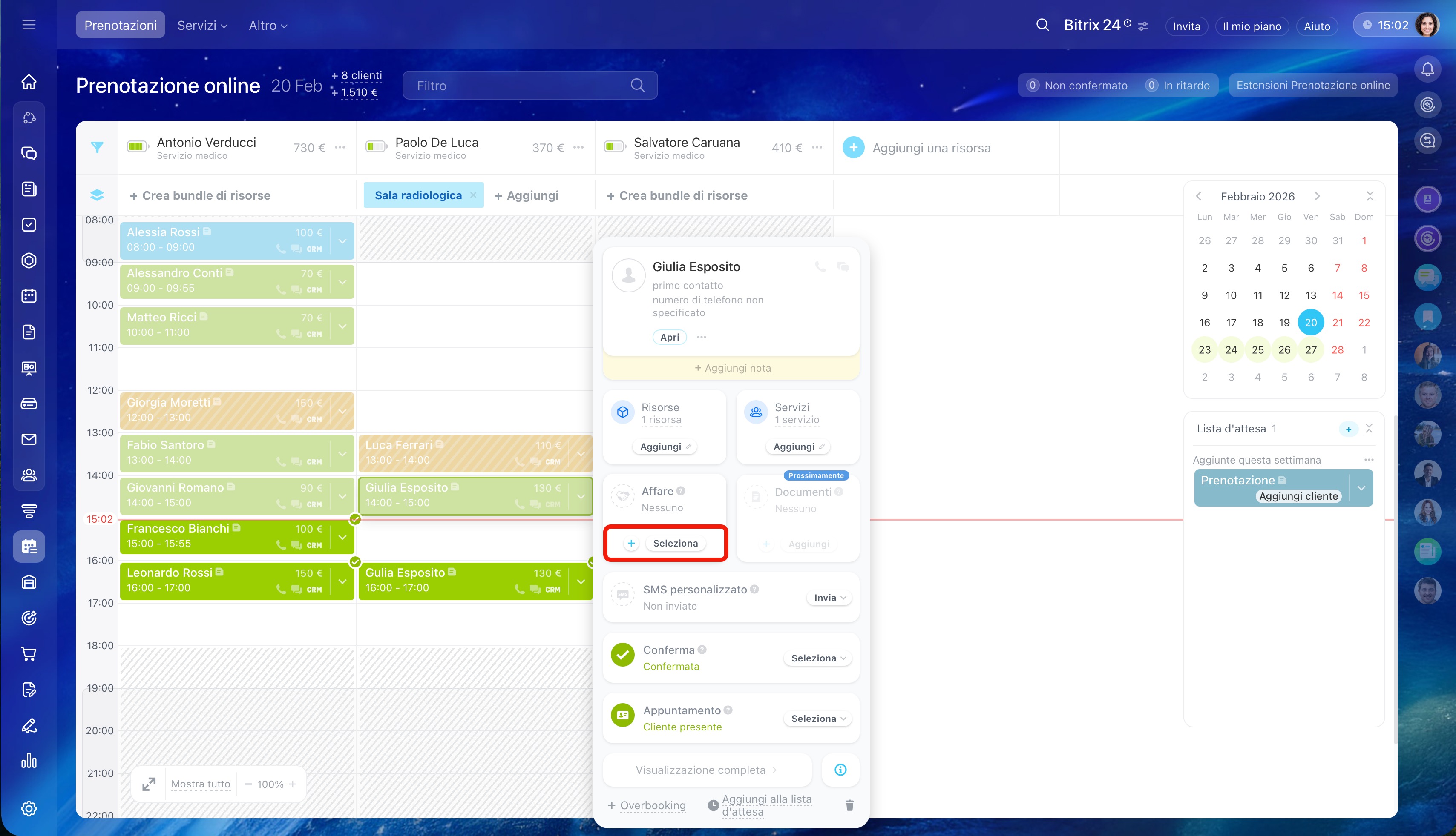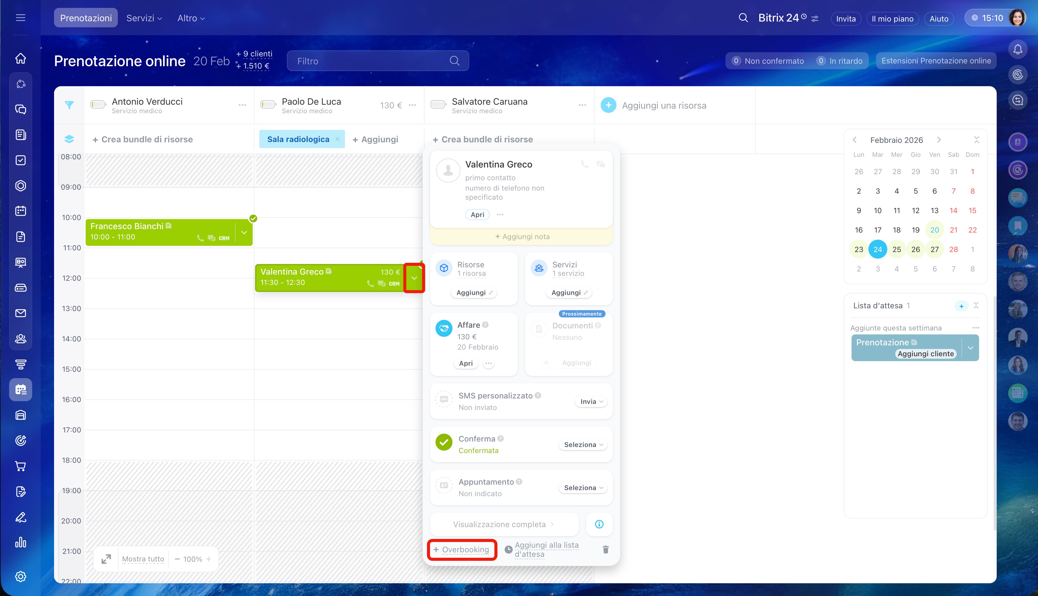 Aggiungere un cliente alla prenotazione. Clicca sulla freccia nel blocco della prenotazione esistente e seleziona Overbooking. Compila la scheda: aggiungi il cliente e l'affare.
