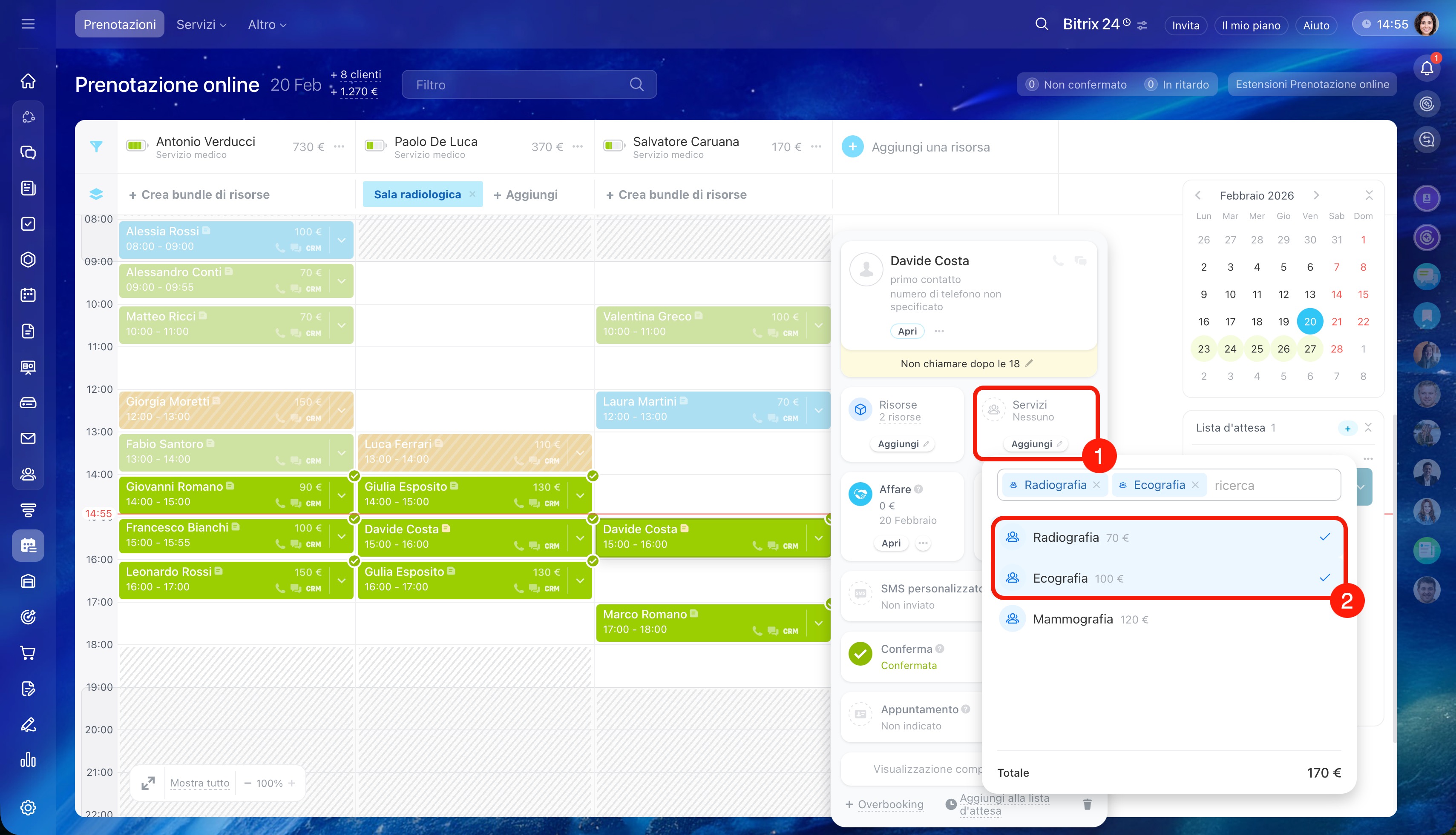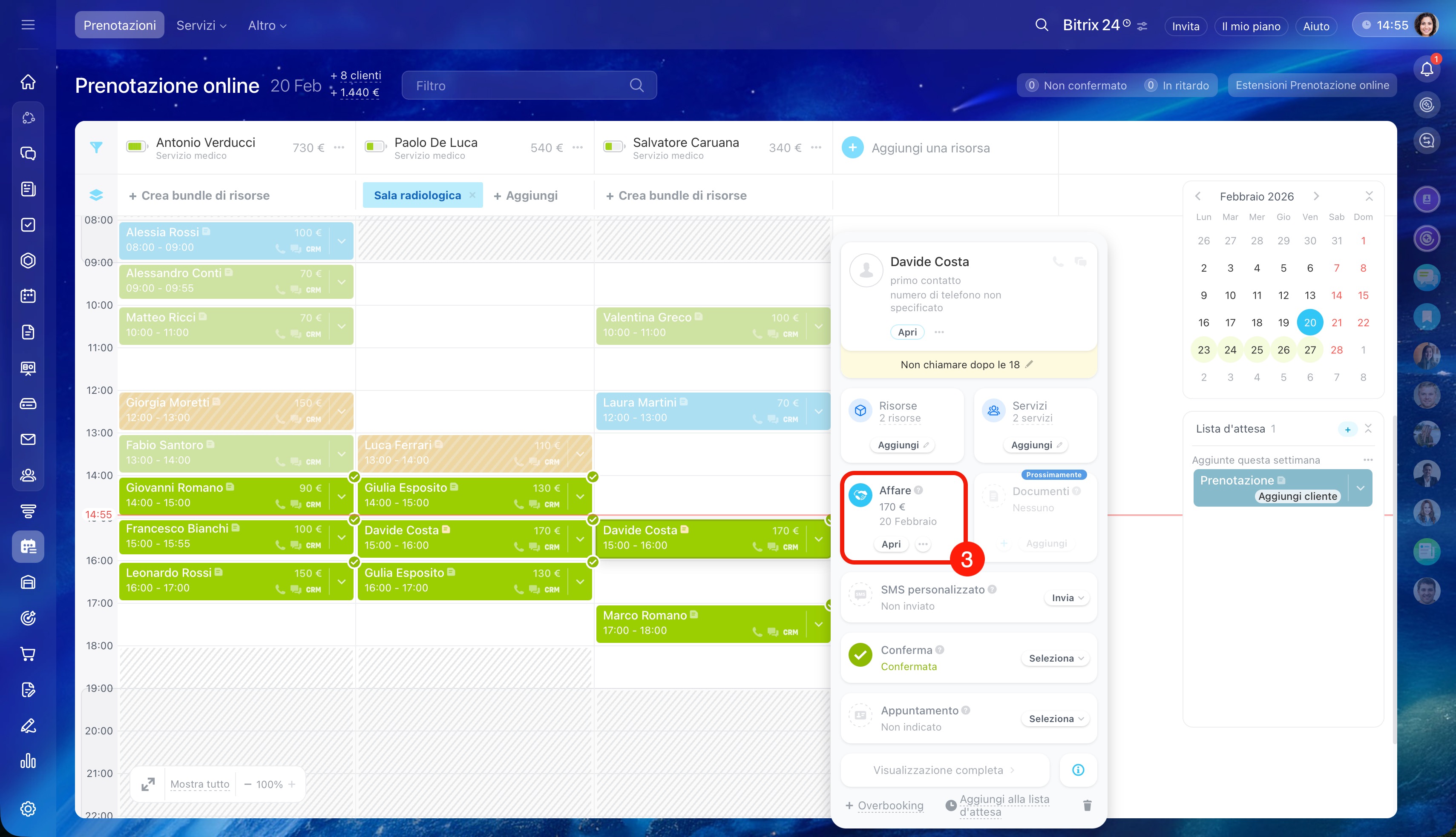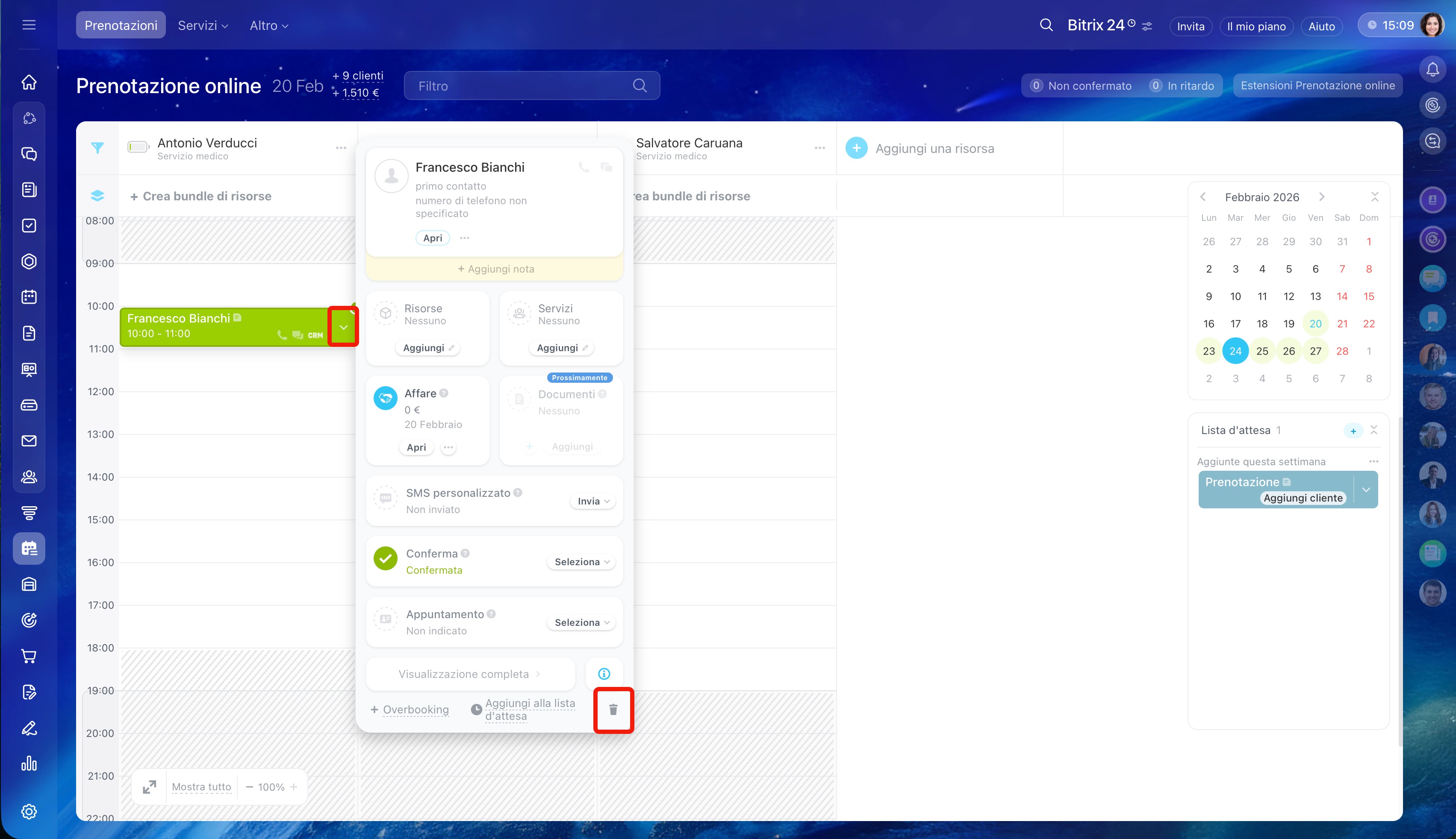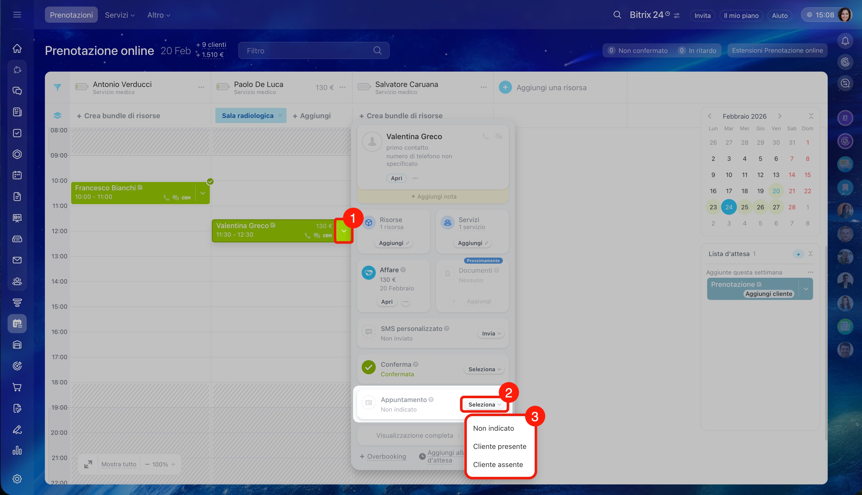 Aggiungere un cliente alla prenotazione. Clicca sulla freccia nel blocco della prenotazione esistente e seleziona Overbooking. Compila la scheda: aggiungi il cliente e l'affare.