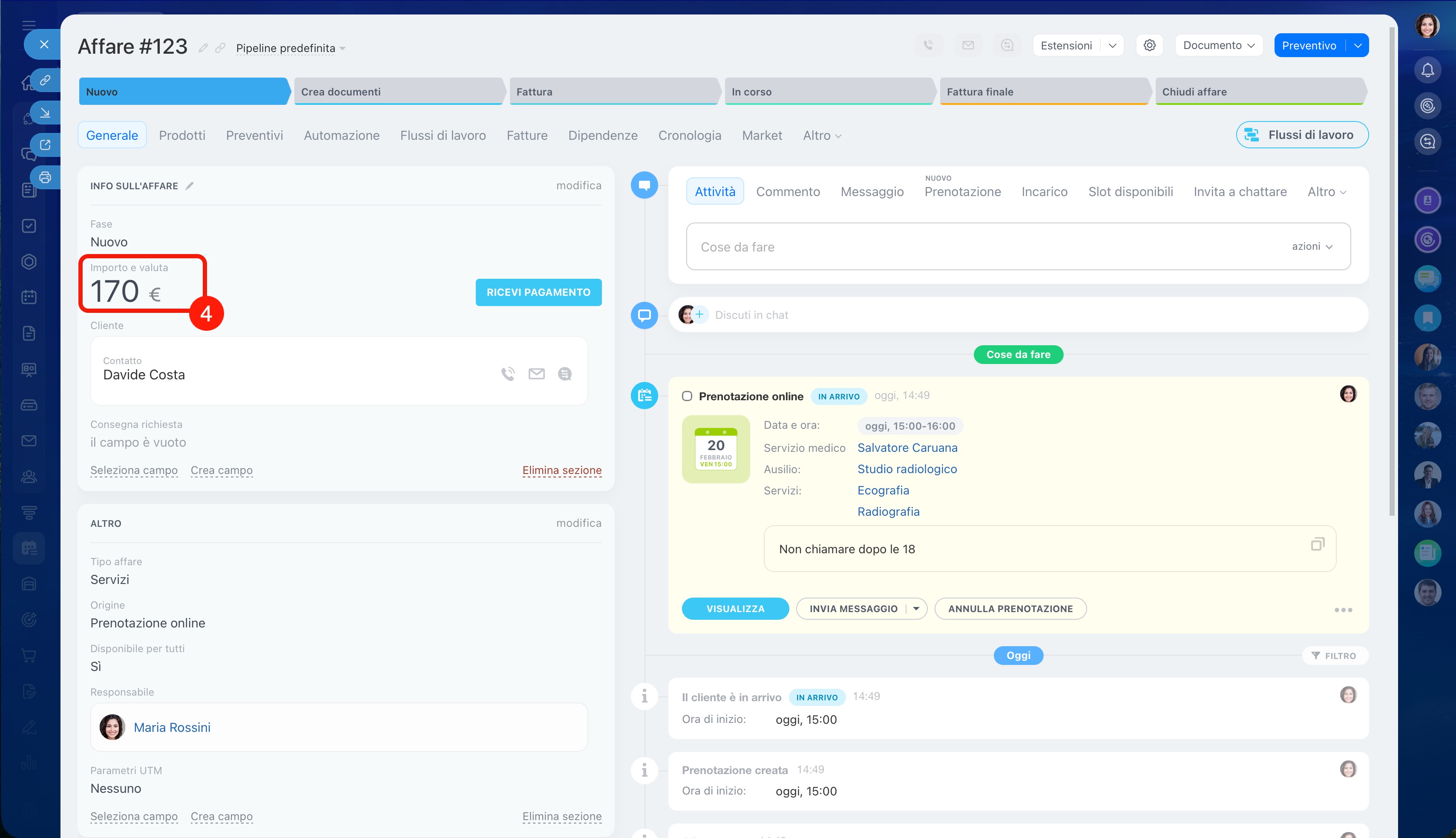 È possibile collegare una prenotazione a un affare specifico nel CRM o crearne uno nuovo.