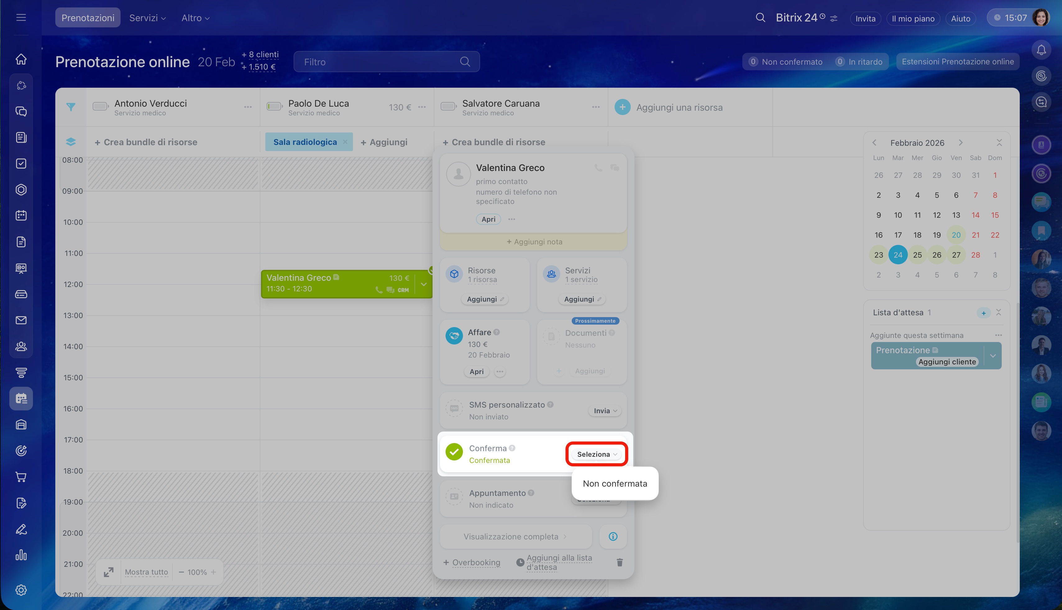 Se il cliente non conferma la prenotazione, puoi chiamarlo e impostare manualmente lo stato desiderato. Ad esempio, se il cliente rifiuta il servizio, seleziona lo stato Non confermata.