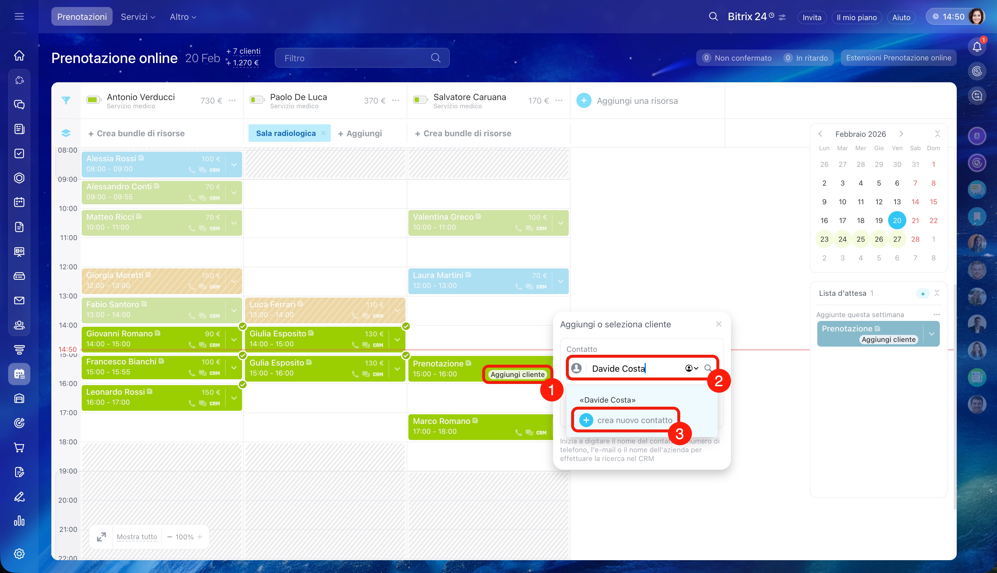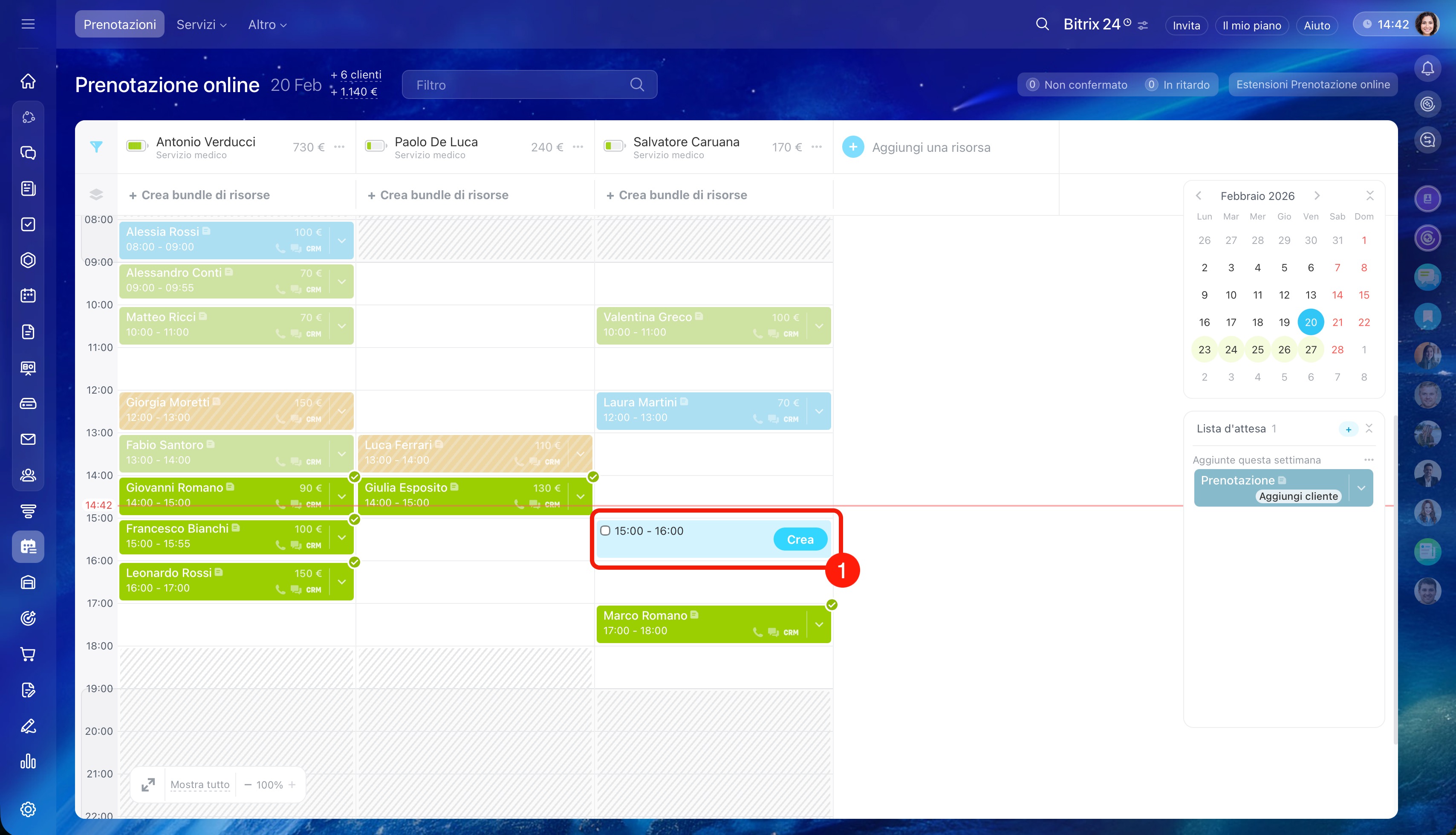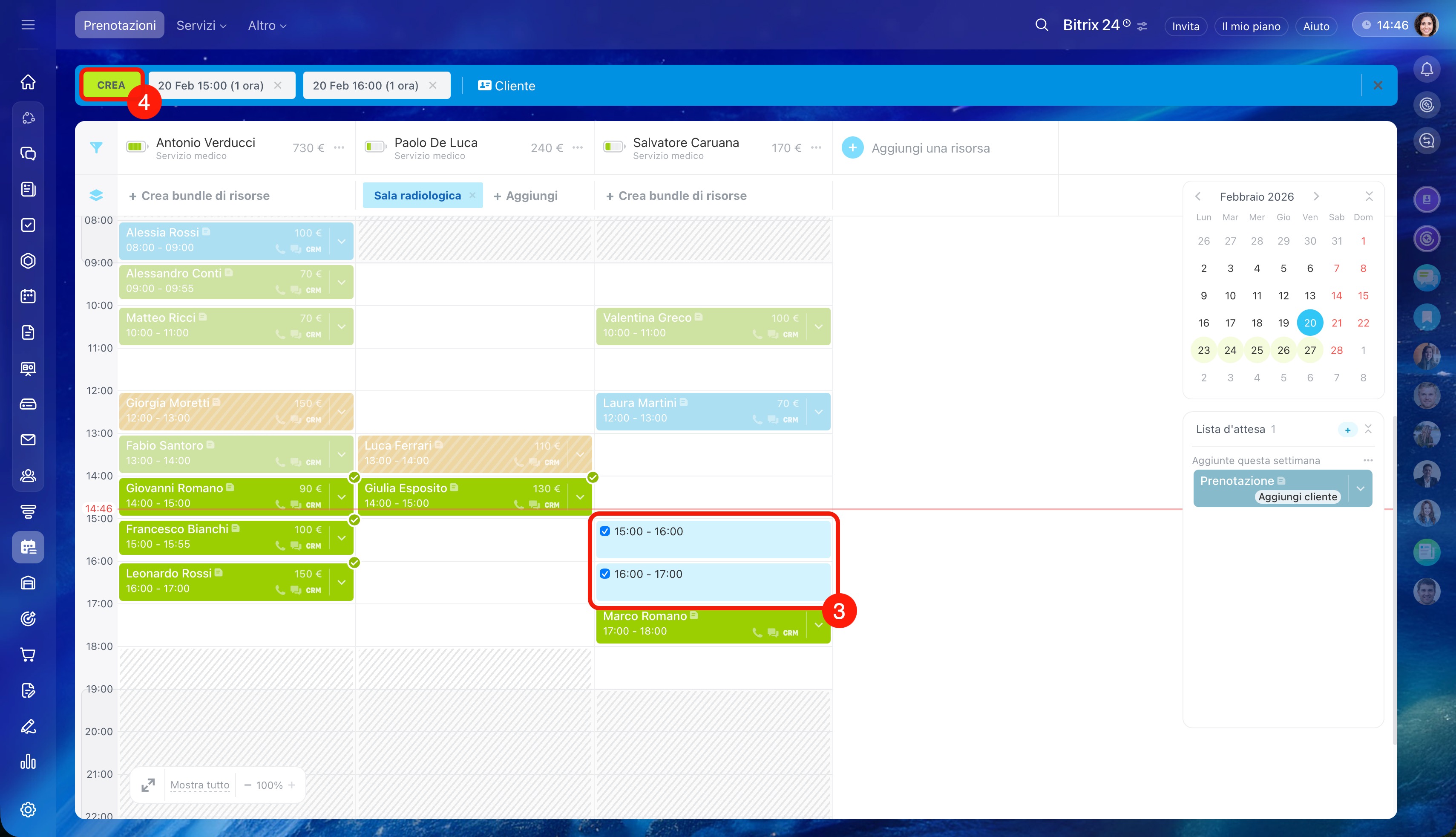 - Seleziona l'orario sotto la risorsa desiderata e clicca su Crea. Per un cliente è possibile creare più prenotazioni contemporaneamente.