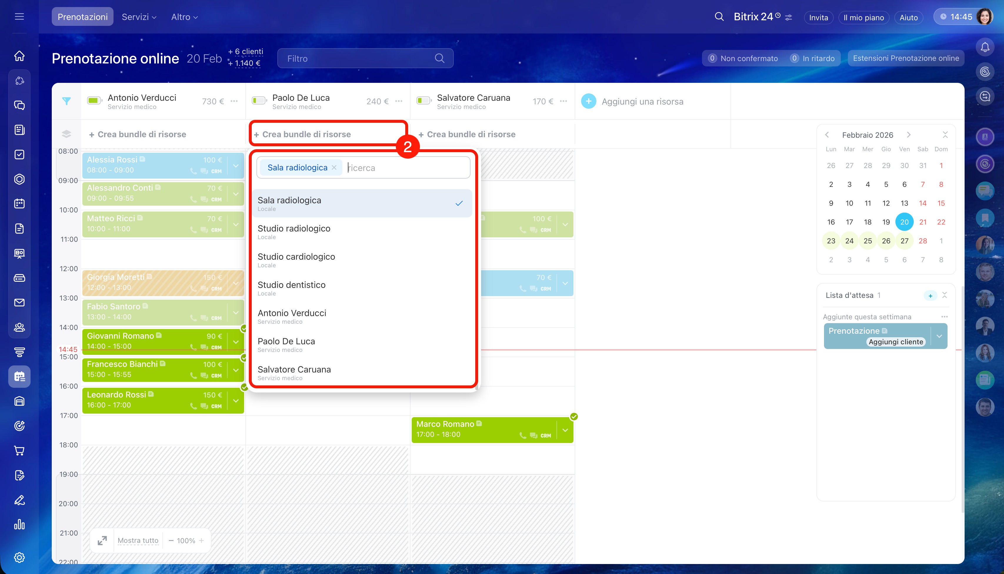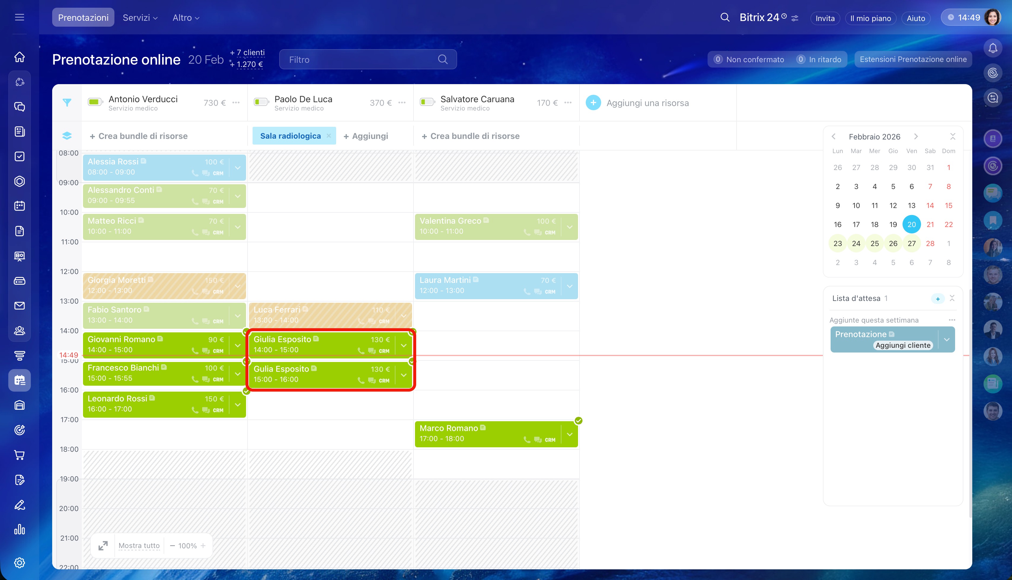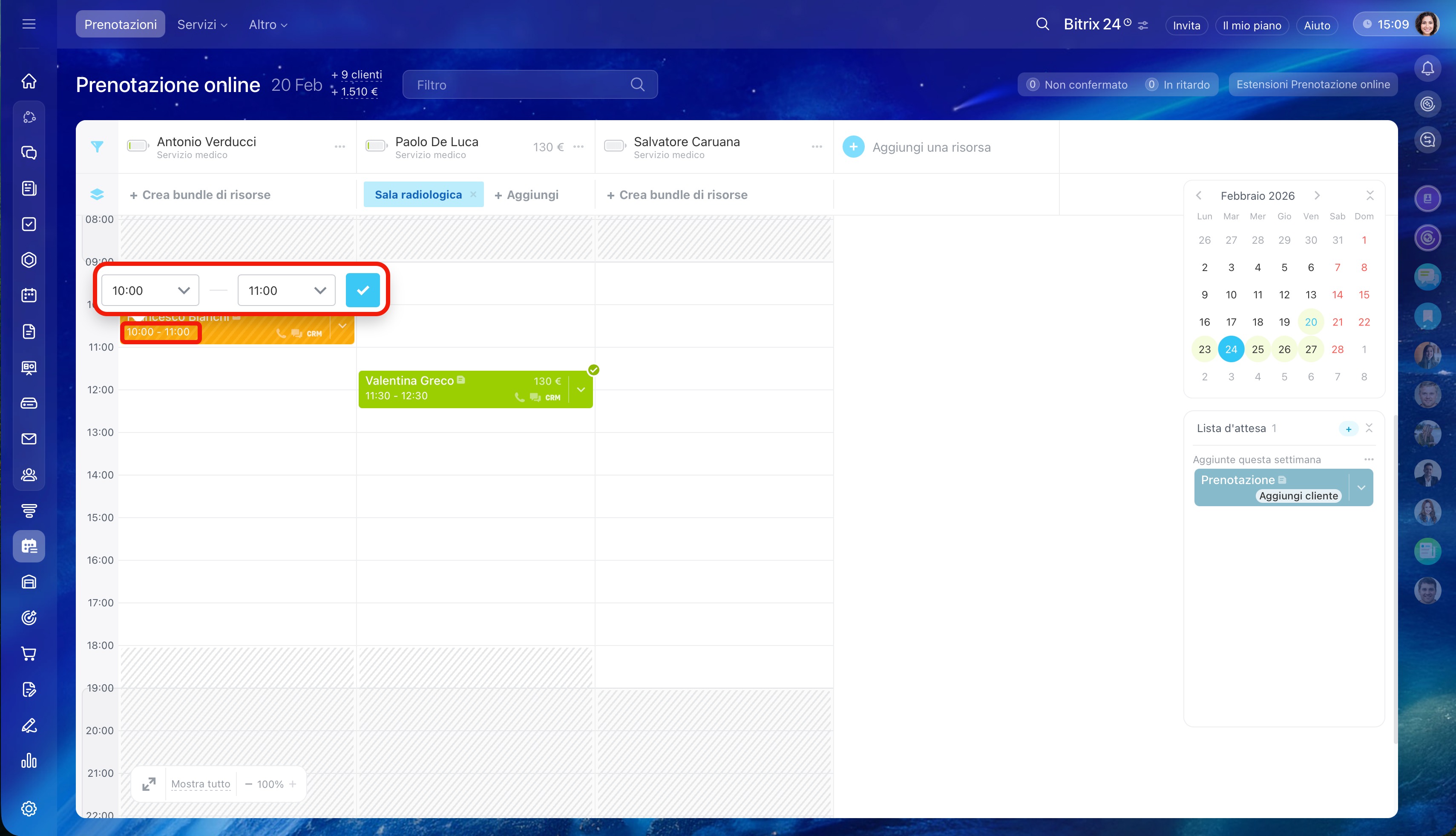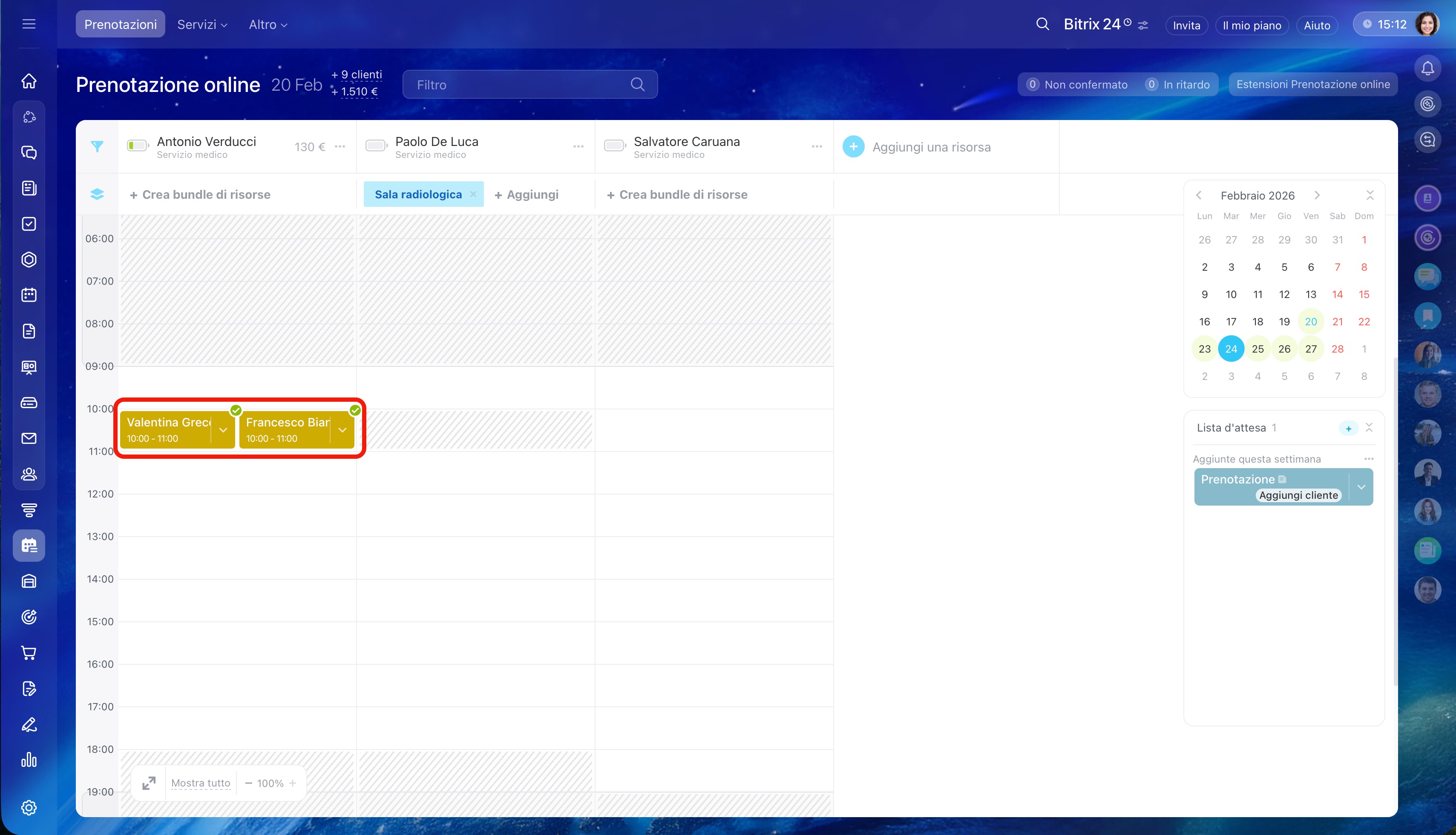 - Seleziona l'orario sotto la risorsa desiderata e clicca su Crea. Per un cliente è possibile creare più prenotazioni contemporaneamente.
