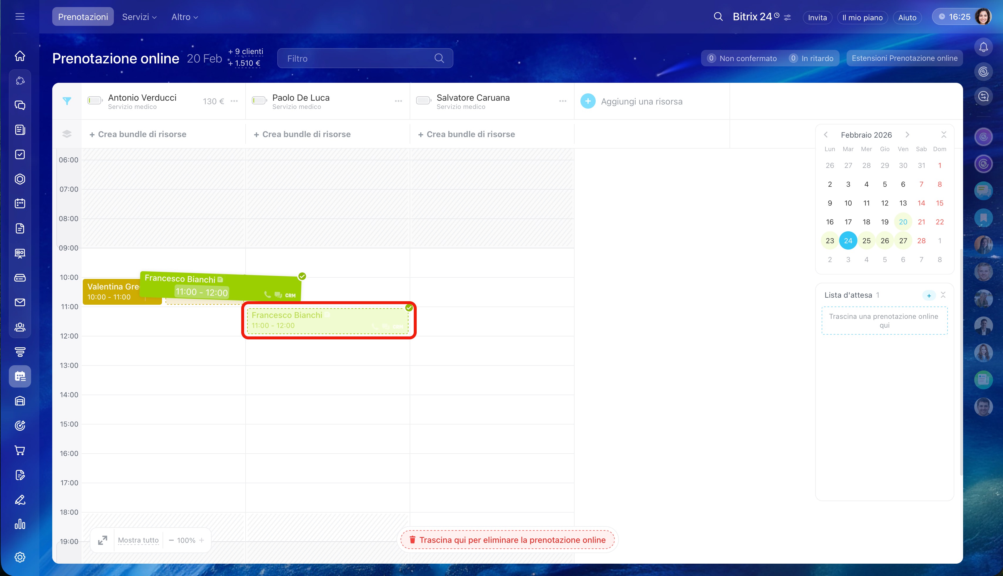 Spostare la prenotazione. Trascina con il mouse una prenotazione esistente e rilasciala nello slot occupato.