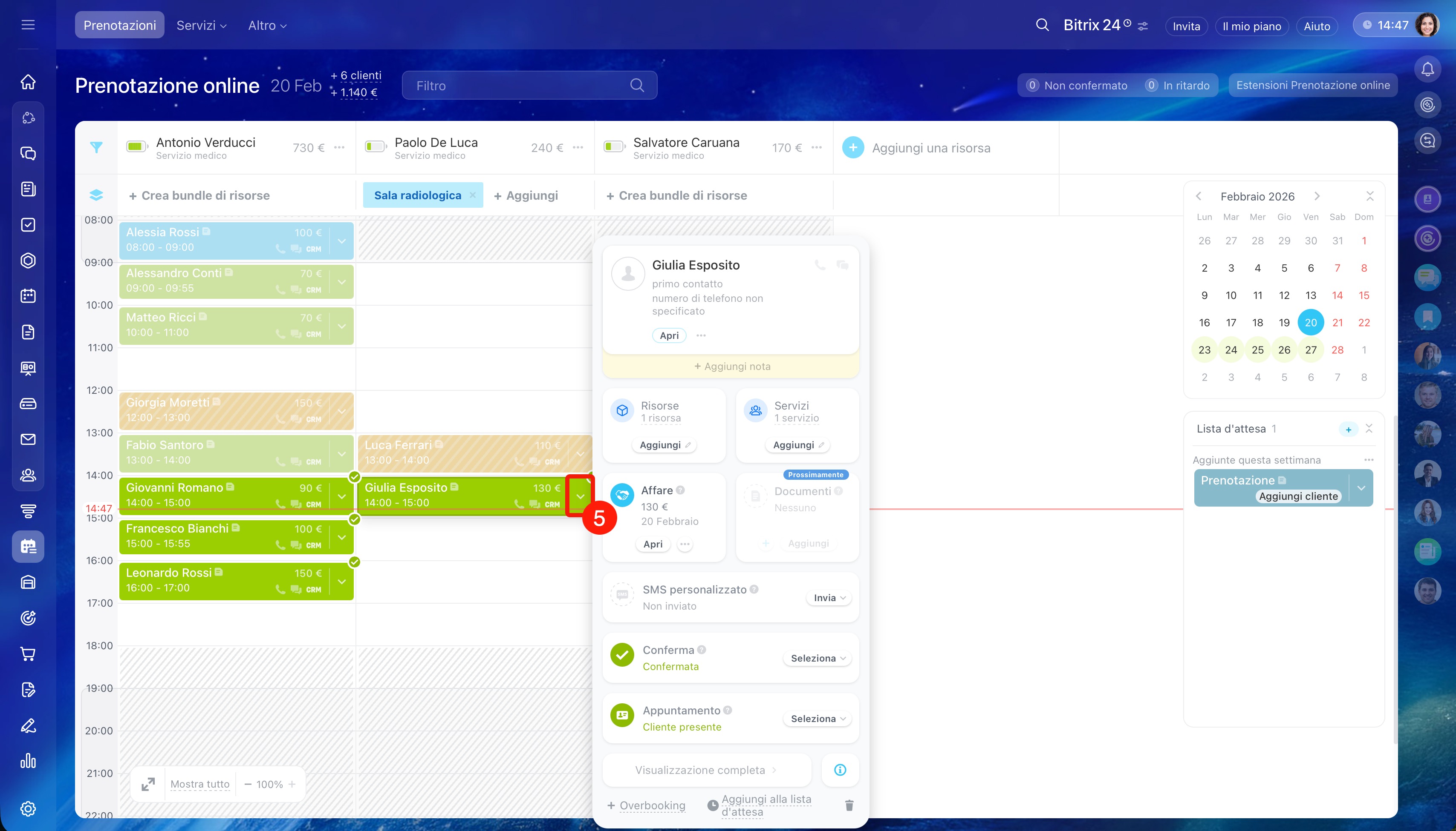 Le prenotazioni in overbooking sono evidenziate in giallo senape nel calendario.