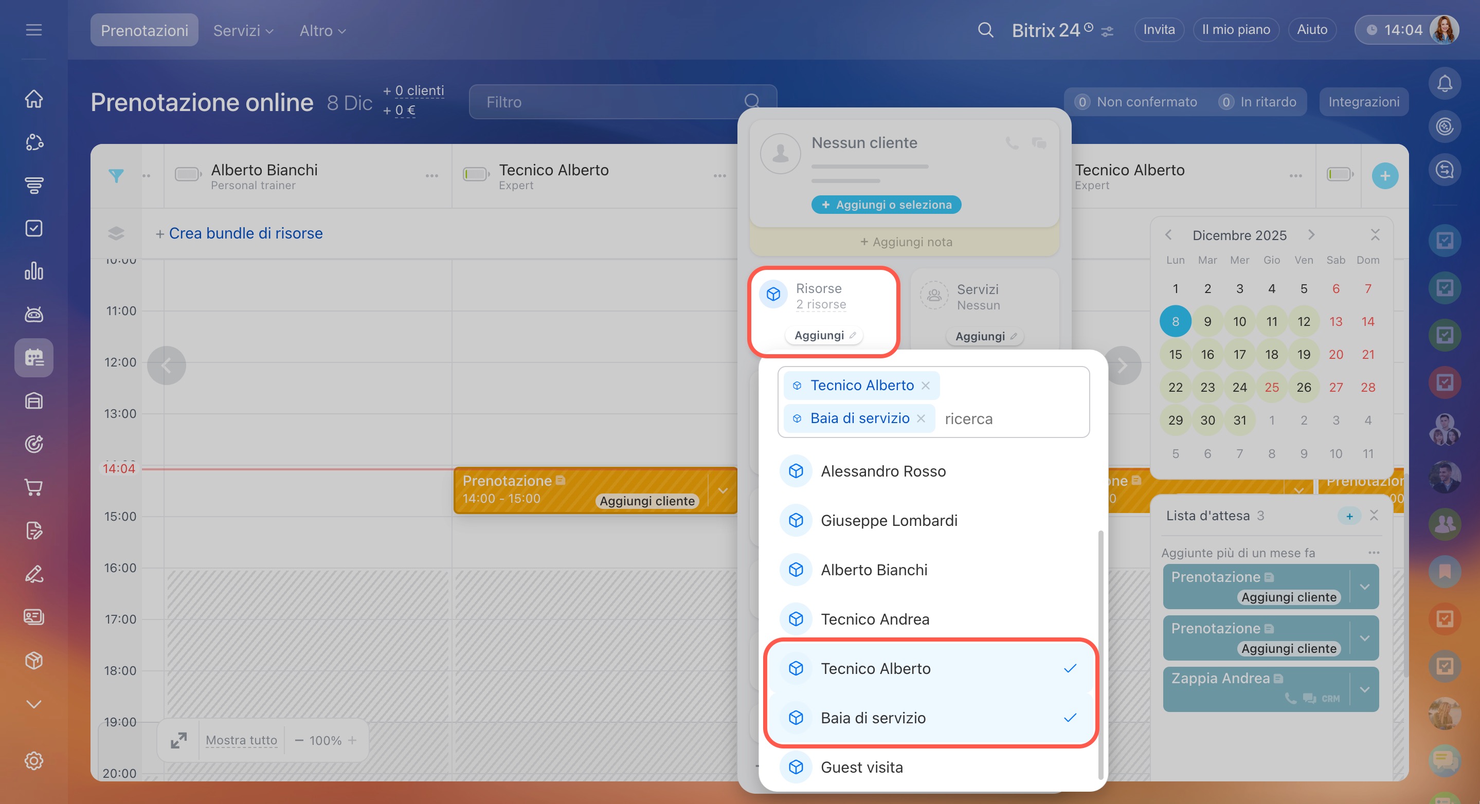 Se per fornire un servizio sono necessarie più risorse, puoi inserirle nella scheda di prenotazione. Ad esempio, per un servizio di riparazione a domicilio potrebbero servire un tecnico e un veicolo aziendale, mentre per un servizio fotografico potrebbero essere necessari un fotografo e uno studio.