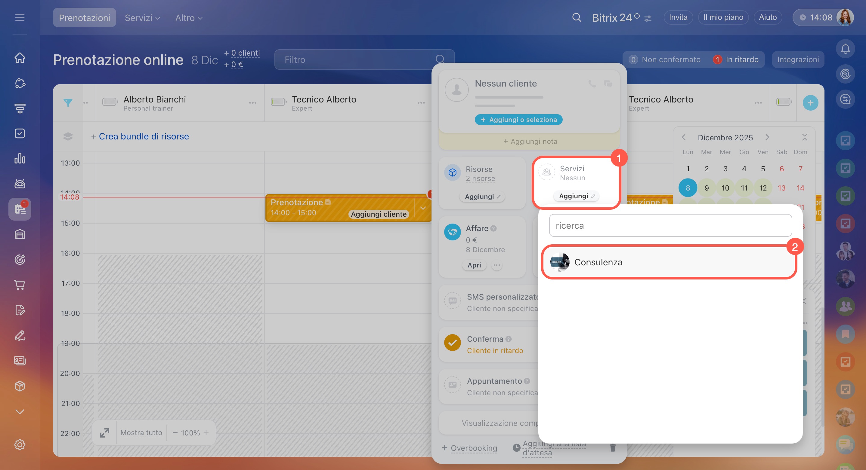 Aggiungere un cliente alla prenotazione. Fai clic sulla freccia nel blocco della prenotazione esistente e seleziona Overbooking. Compila la scheda: aggiungi il cliente e l'affare.