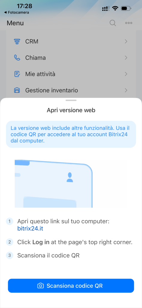 - Puoi scansionare il codice QR con la fotocamera del tuo smartphone o tramite l'app mobile di Bitrix24.
