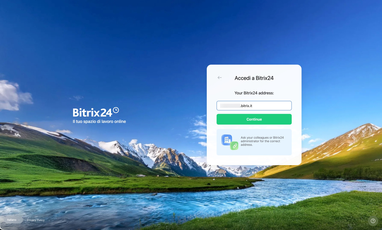 Inserisci l'indirizzo Bitrix24 a cui desideri accedere. Quindi, fai clic su Continua.