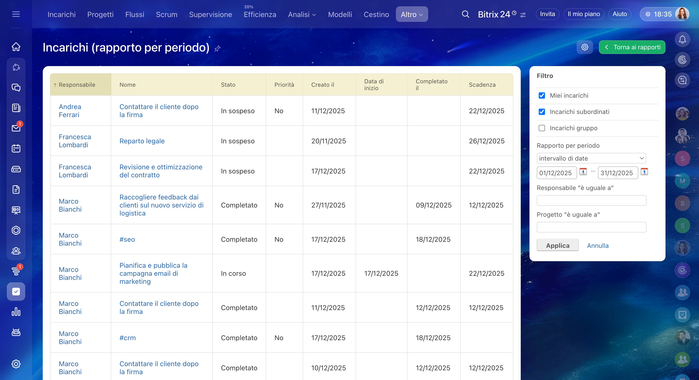 Gli incarichi in Bitrix24 semplificano l'organizzazione del lavoro di team, consentendo di assegnare incarichi e gestire progetti di grandi dimensioni. Aiutano a monitorare i progressi dei dipendenti, a controllare le scadenze e a distribuire le responsabilità.