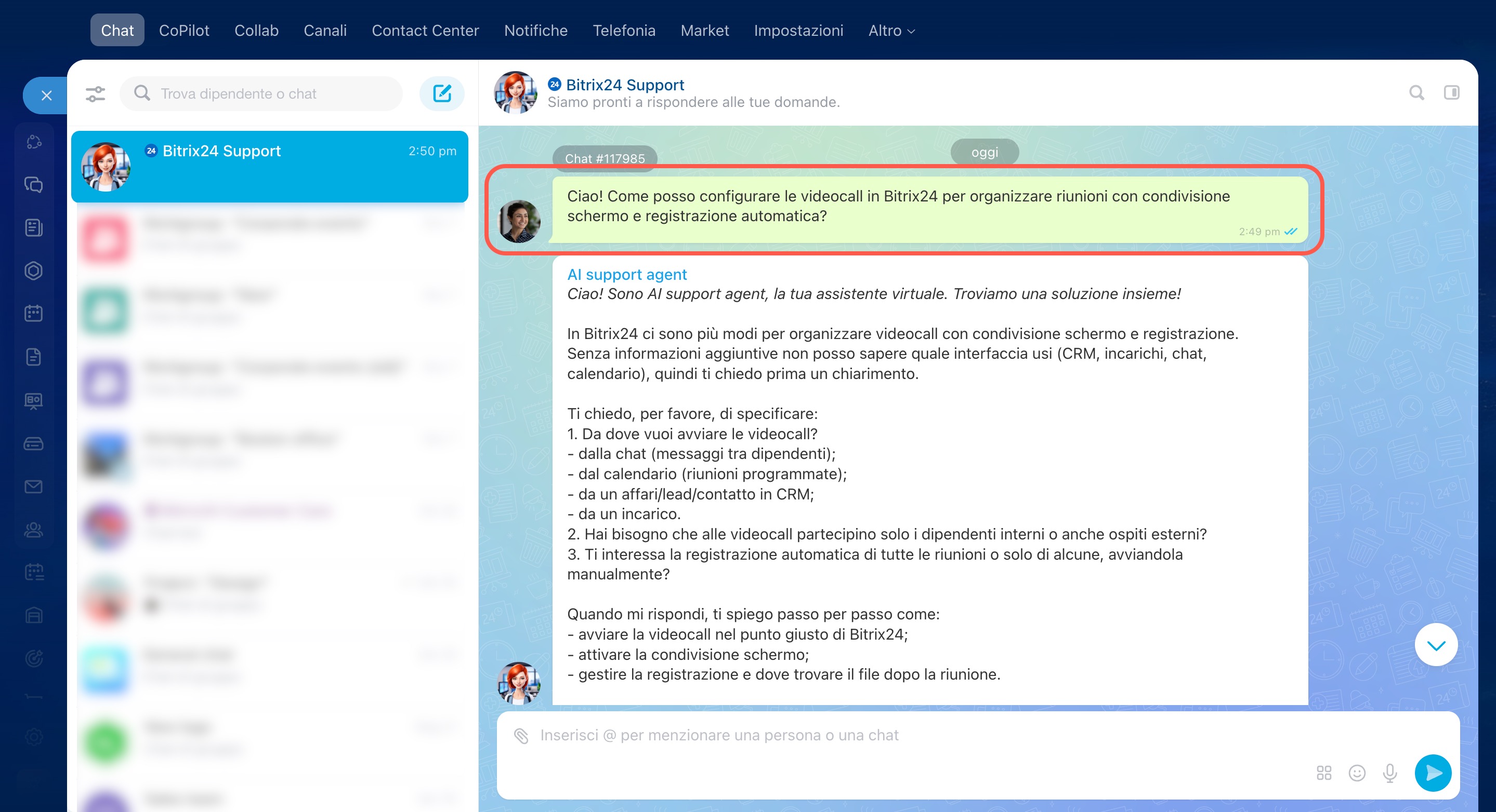 - Gli amministratori e i partner di Bitrix24 possono scrivere all'assistente virtuale IA. Per porre una domanda, clicca su Aiuto > Apri la chat > Ho ancora bisogno di assistenza > Contatta il supporto.