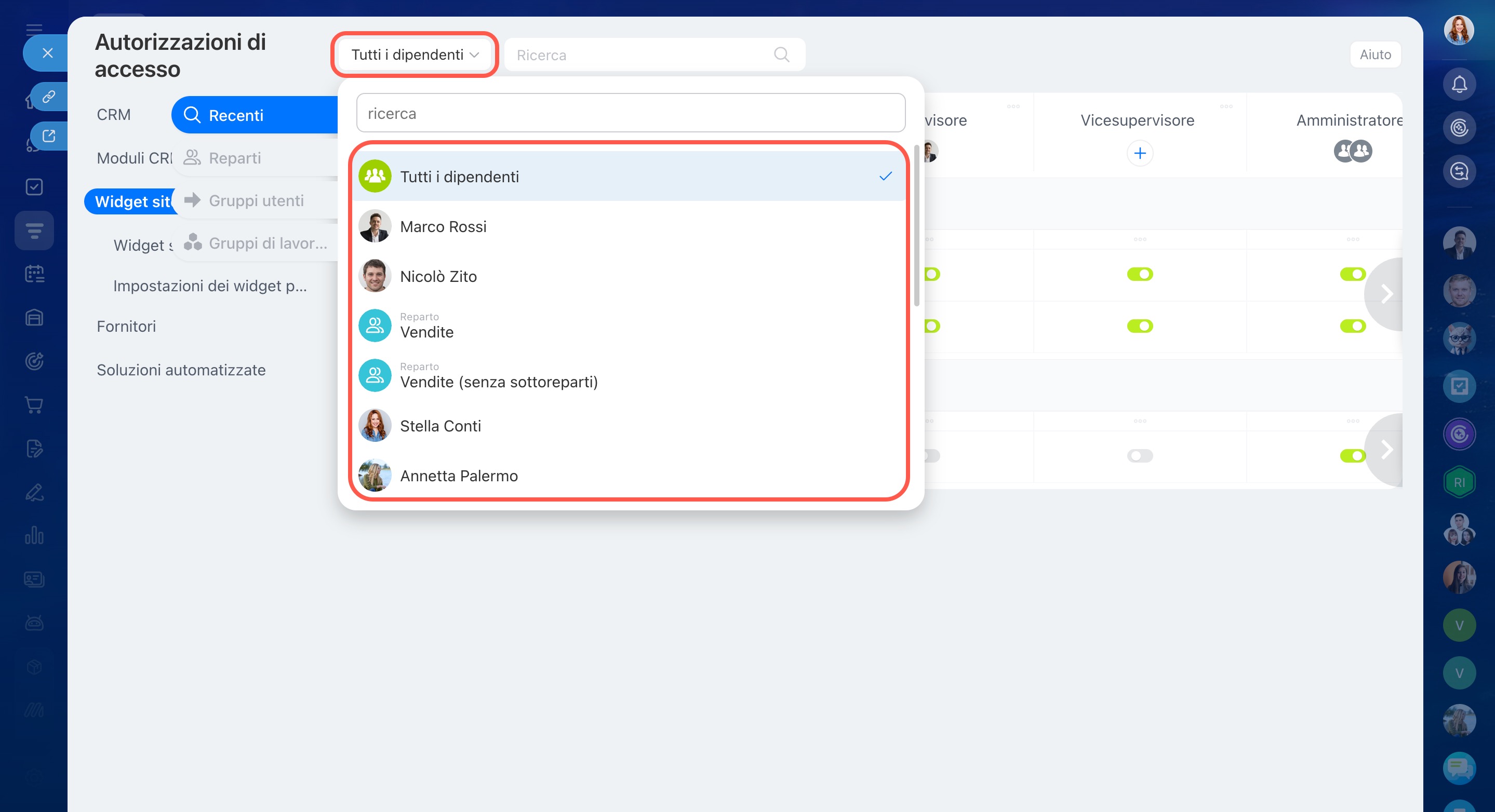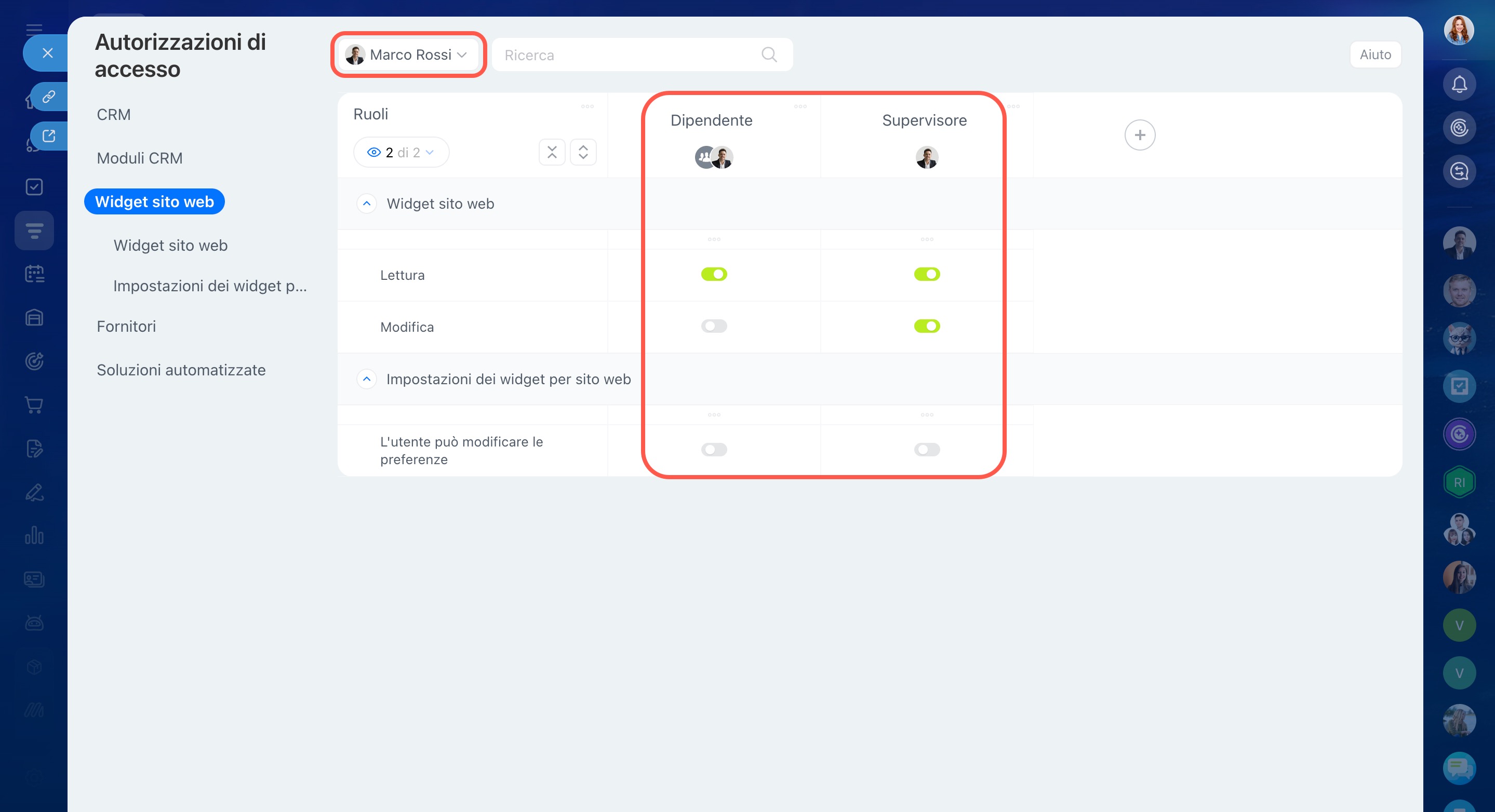- Se sono stati creati altri ruoli nelle impostazioni delle autorizzazioni CRM, appariranno automaticamente nelle impostazioni dei widget.