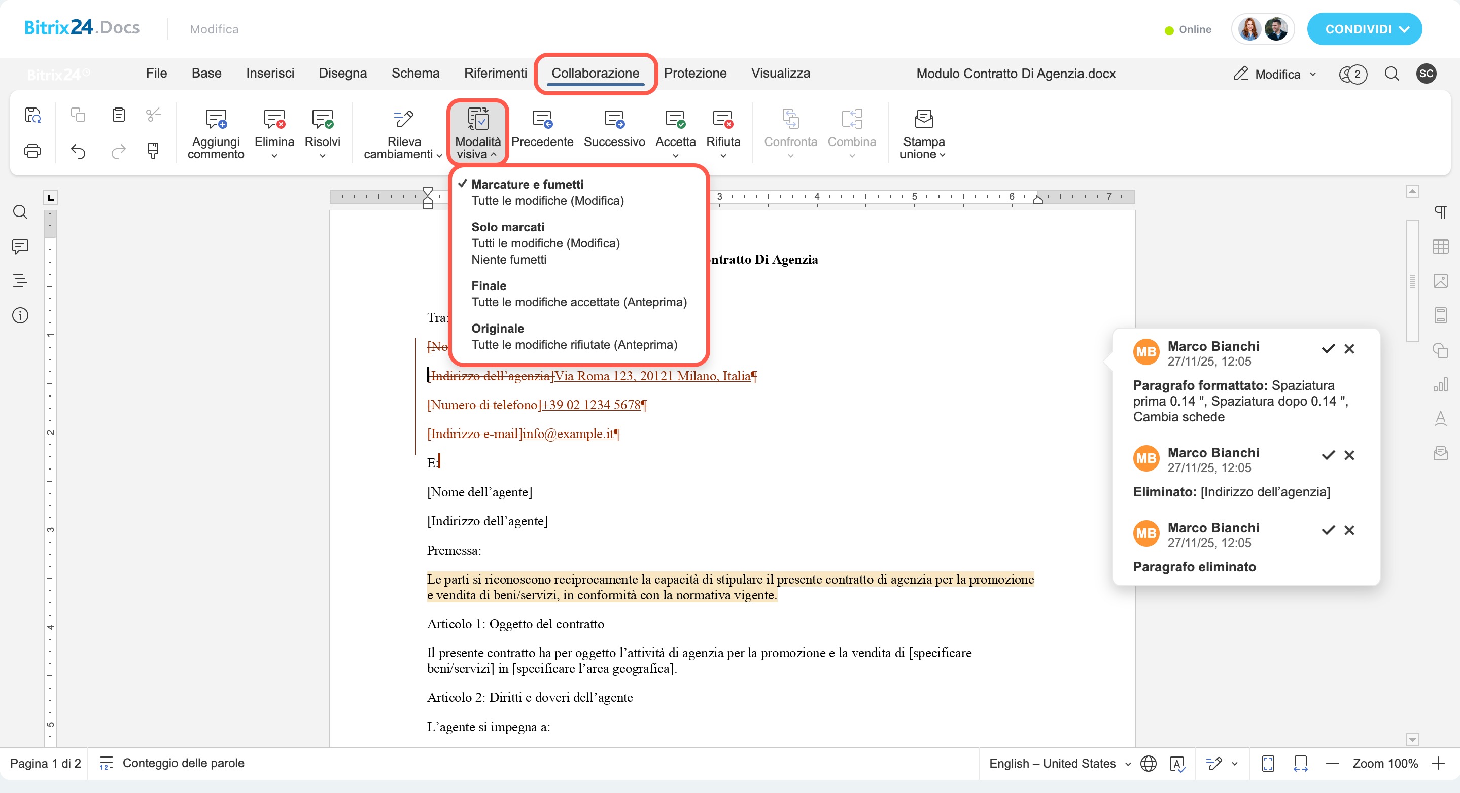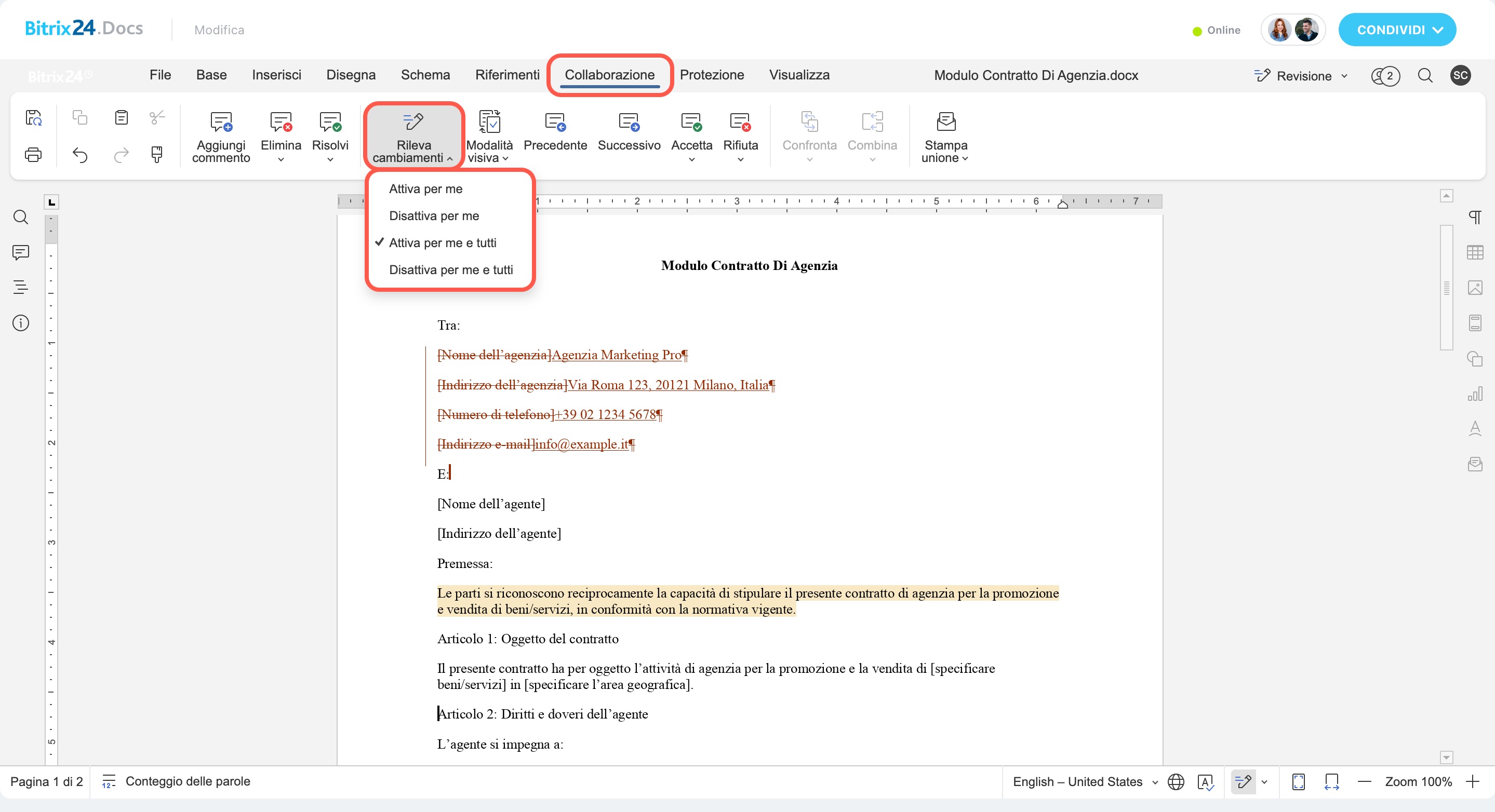 Collaborazione → Traccia cambiamenti → seleziona: