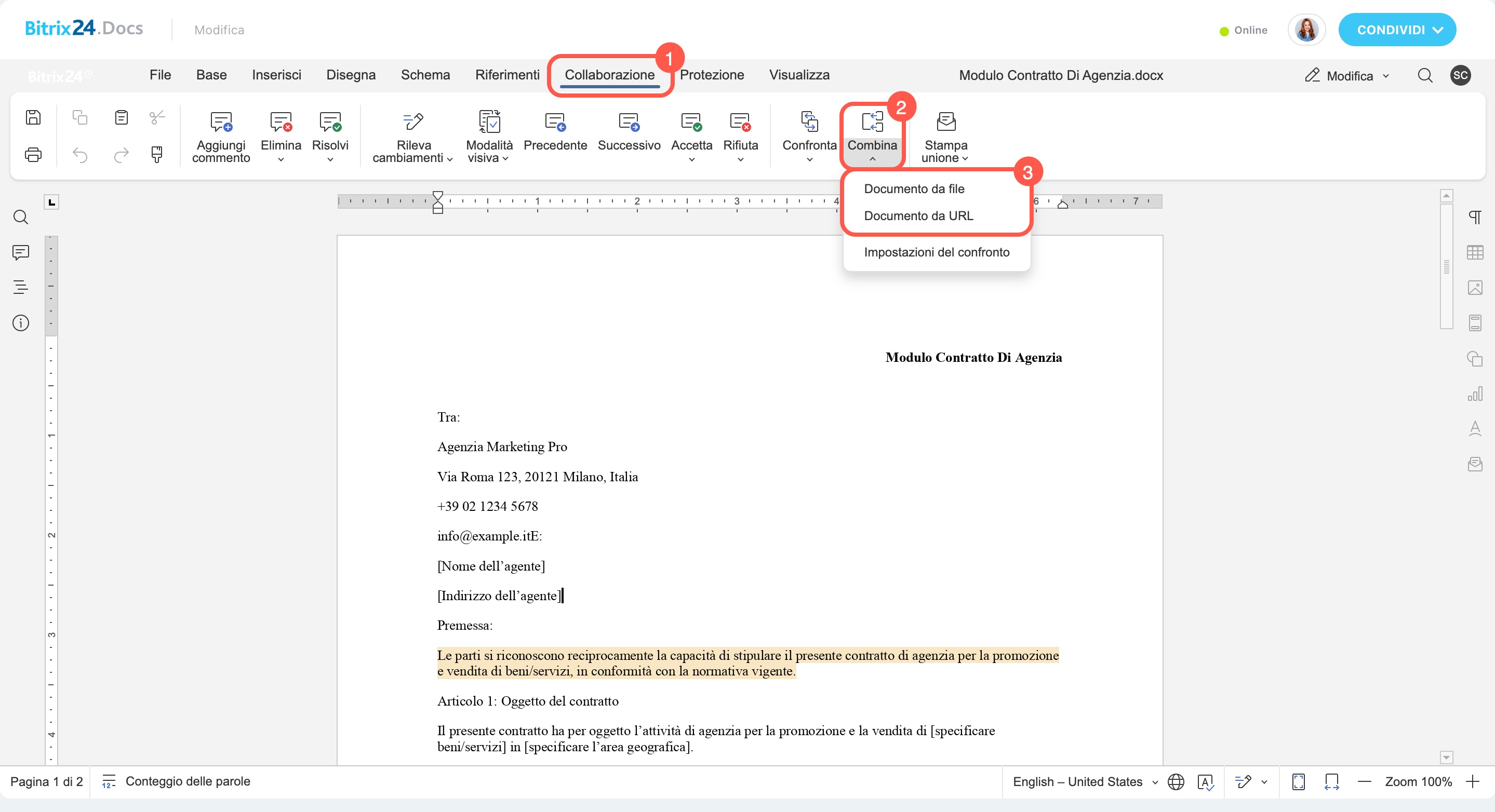 - Collaborazione → Combina → Documento da URL