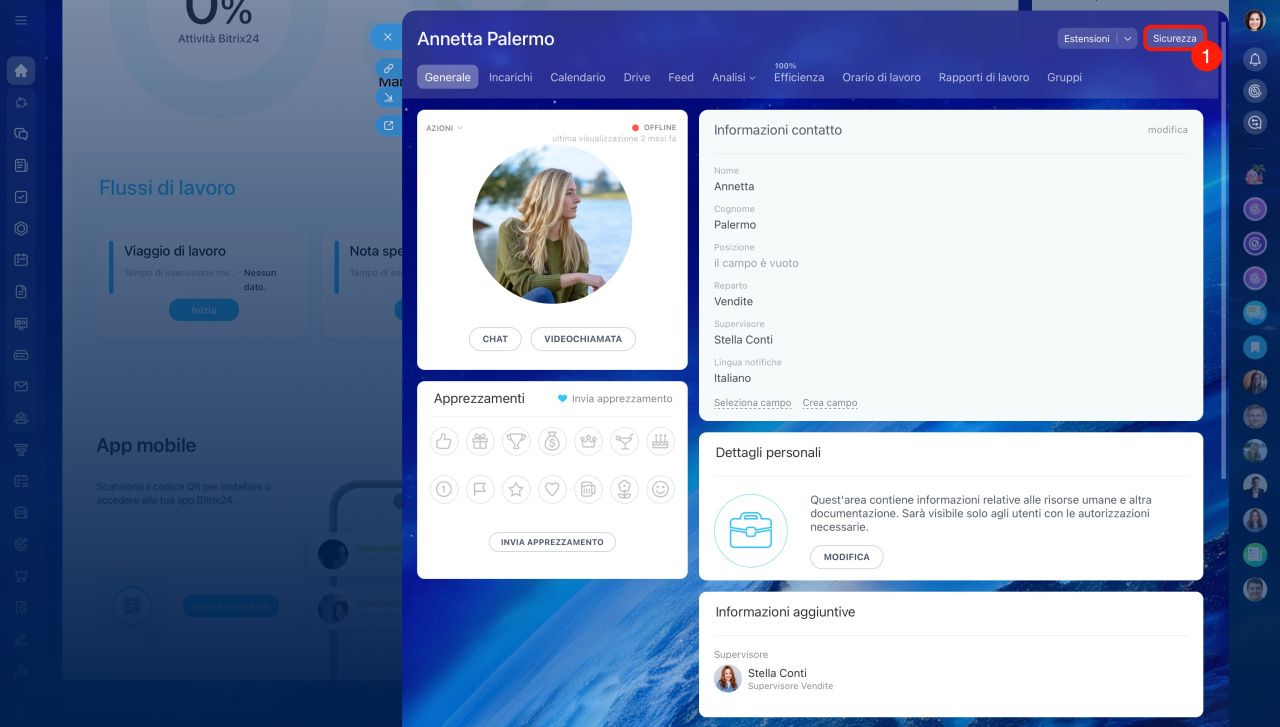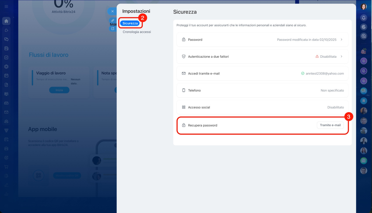 Recupera la password tramite l'amministratore di Bitrix24. L'amministratore di Bitrix24 può inviare un link di recupero password al dipendente. Per farlo, deve andare nel profilo personale del dipendente nella sezione Sicurezza > Recupera password tramite e-mail o Recupera password tramite numero di telefono.