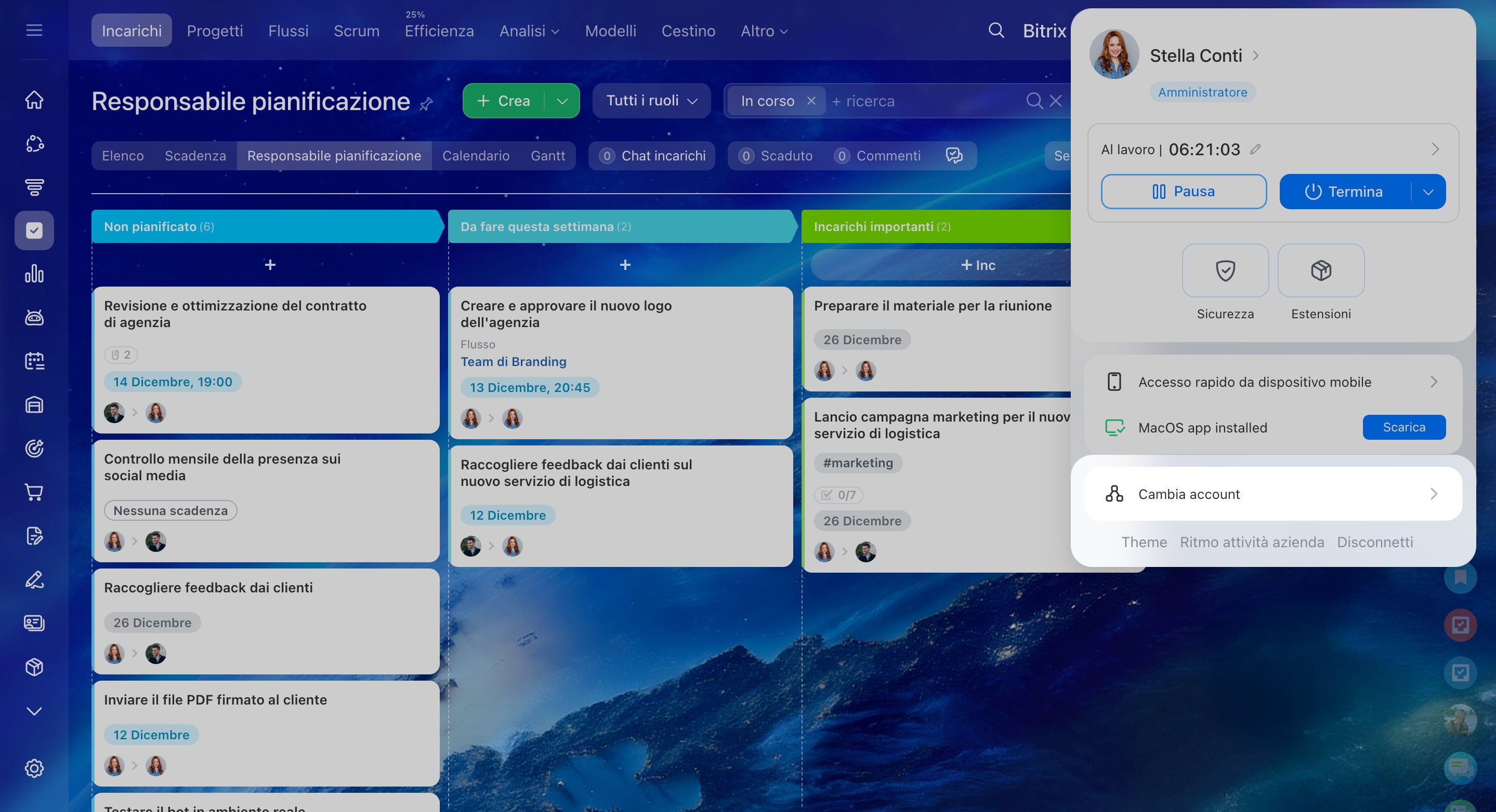 Accedi a Bitrix24 Network: un account unico per tutti i Bitrix24 che hai creato o in cui sei stato invitato. Fai clic su Cambia account.