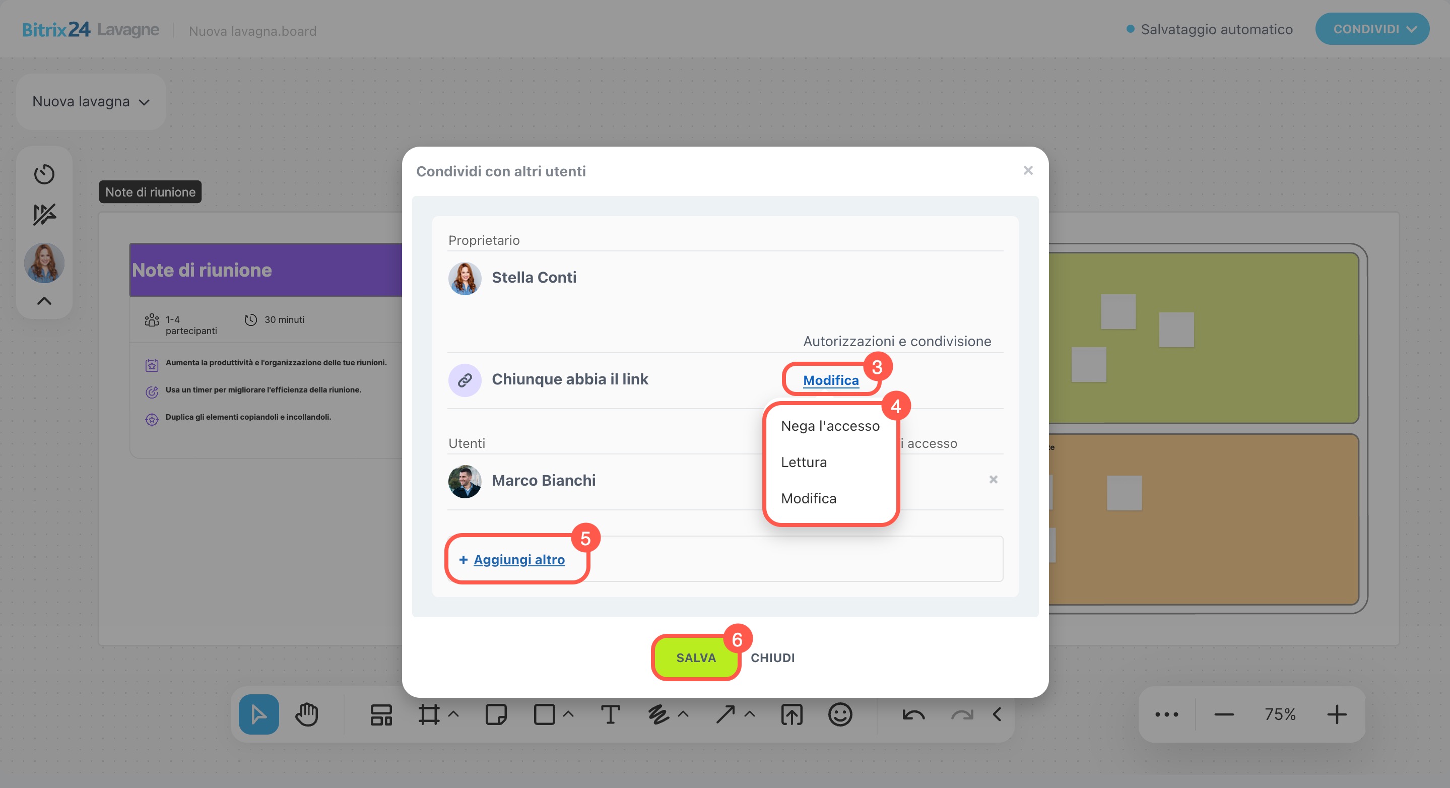 - Nelle lavagne puoi configurare le autorizzazioni di accesso per ogni partecipante.