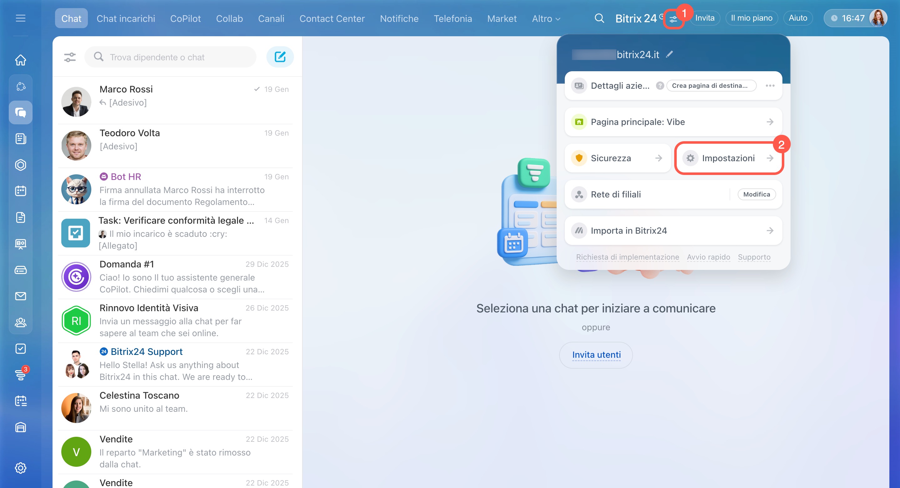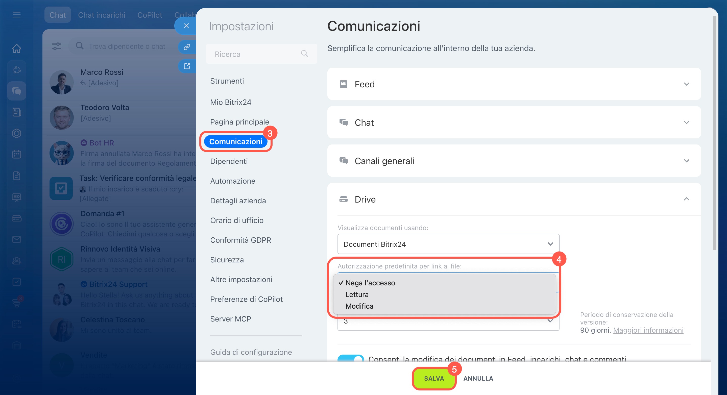accanto al nome del tuo Bitrix24. - Vai su Impostazioni (⚙️) > Comunicazioni > Drive.