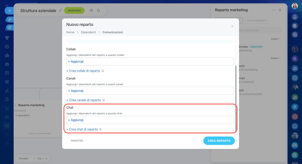 Quando crei un gruppo di lavoro o un progetto, puoi aggiungere un intero reparto in una sola volta. Non è necessario invitare i dipendenti uno per uno: tutti i membri del reparto si uniranno automaticamente. Ad esempio, aggiungi i reparti Marketing e Analisi a un gruppo di lavoro per collaborare a una campagna pubblicitaria.