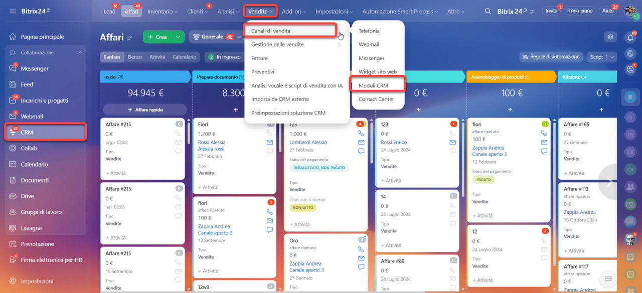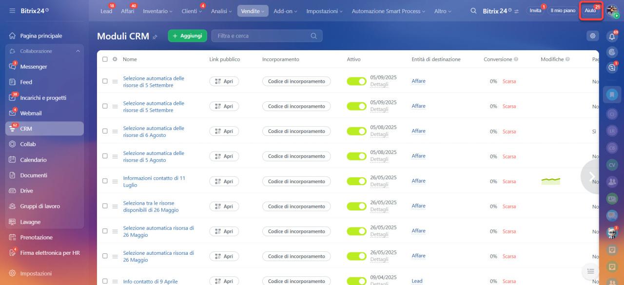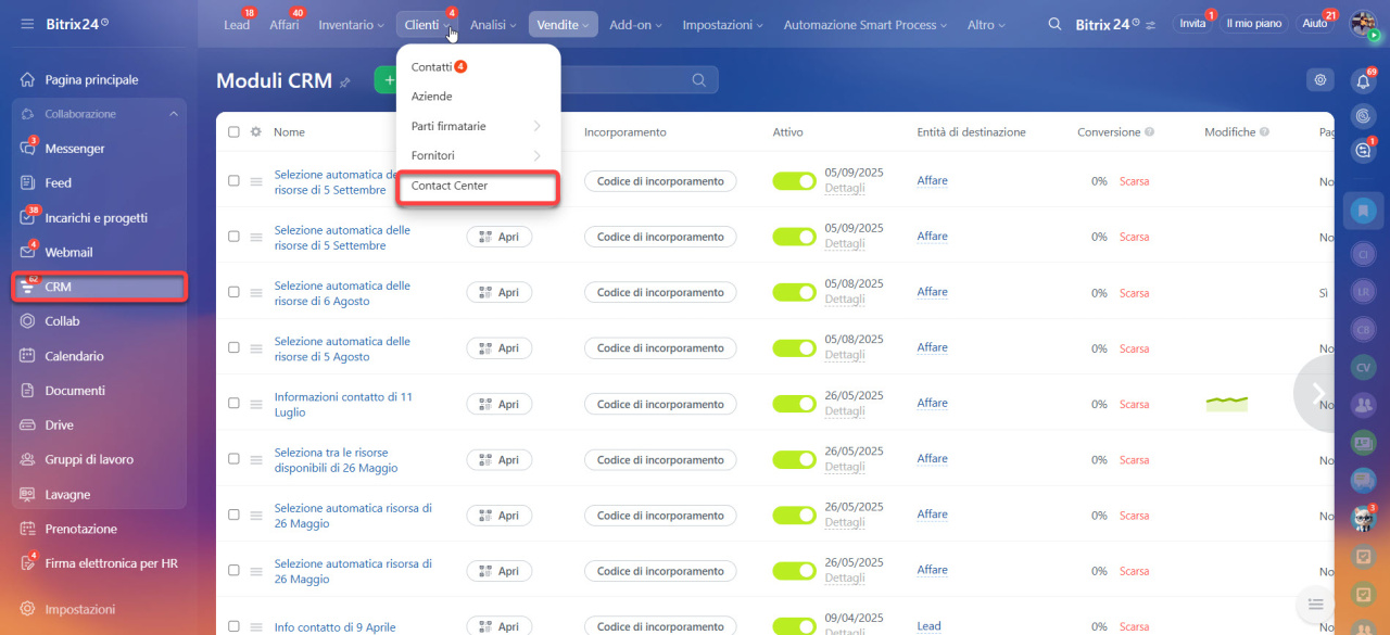 - Vai nella sezione CRM > Vendite > Canali di vendita > Moduli CRM.