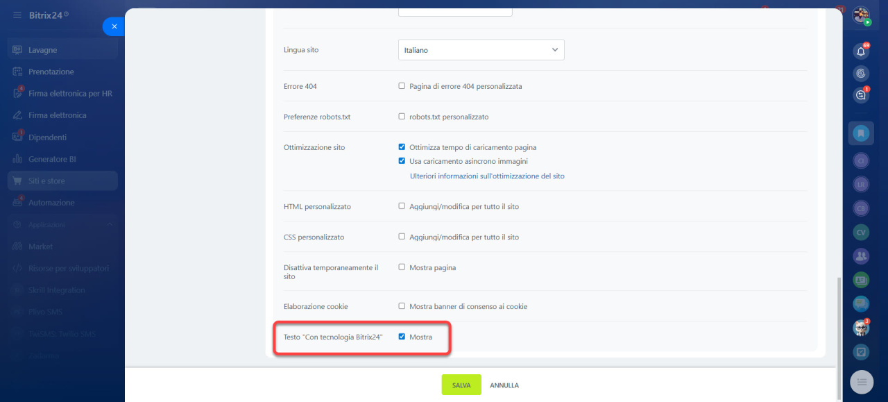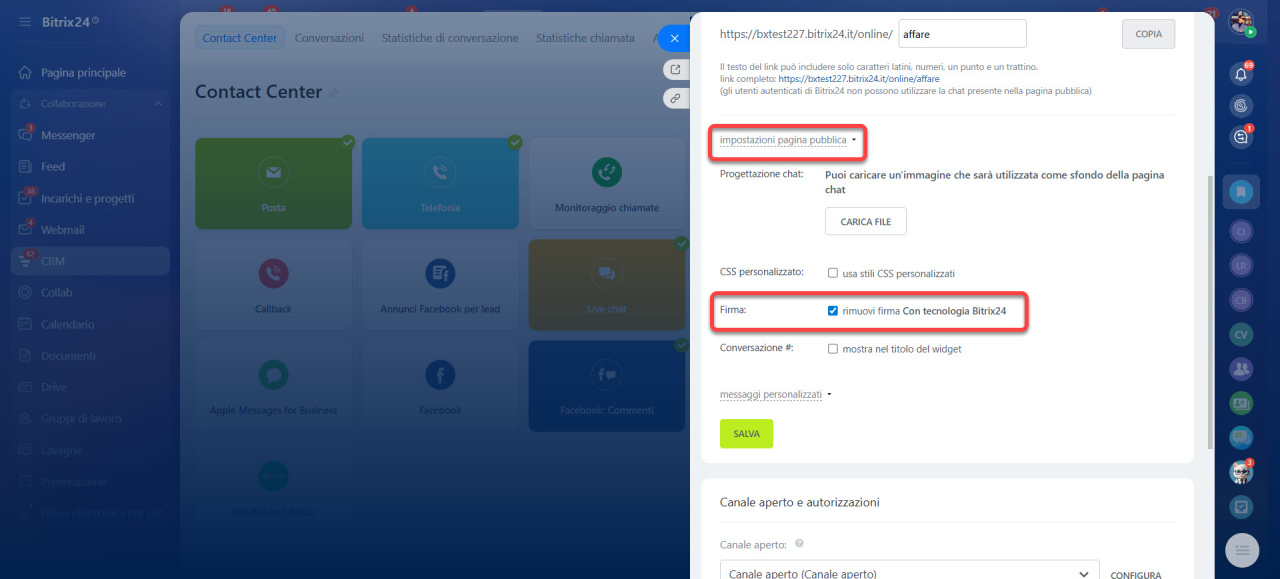 - se è possibile rimuovere la firma "Con tecnologia Bitrix24"