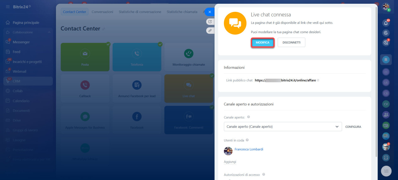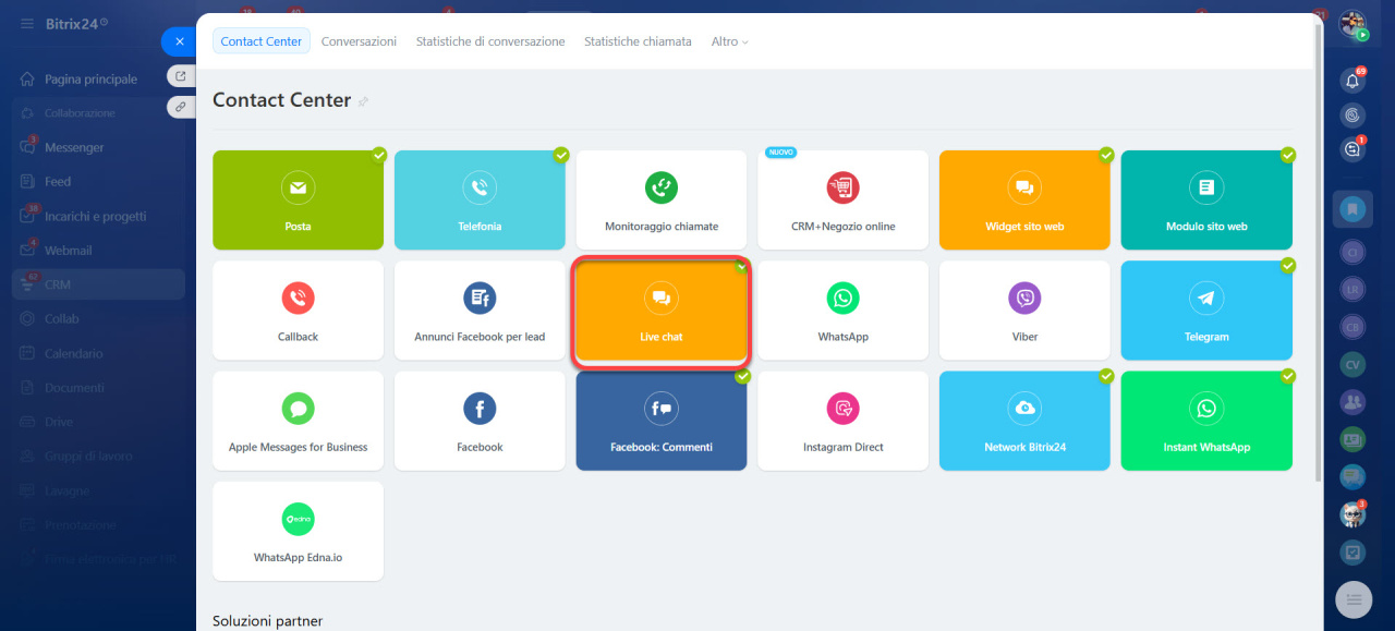 - Vai nella sezione CRM > Clienti > Contact Center > Chat dal vivo.
