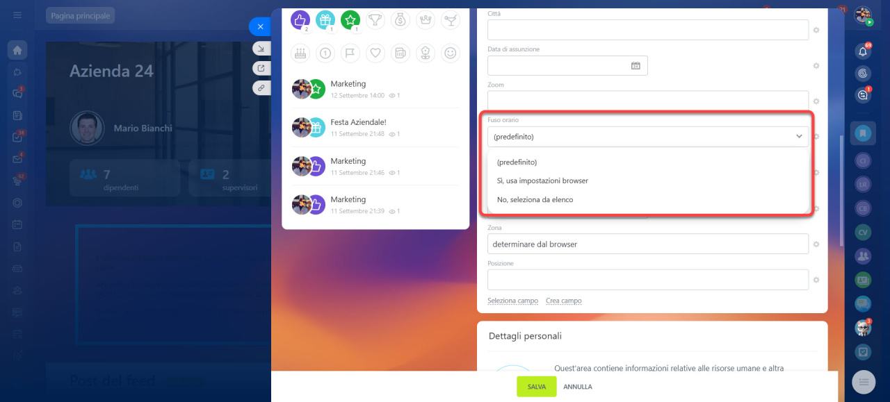 Per impostazione predefinita, il fuso orario si basa sulle impostazioni del browser. Per cambiarlo manualmente: