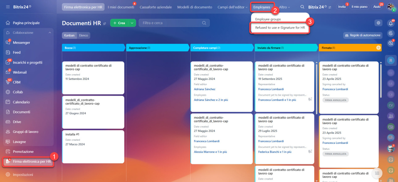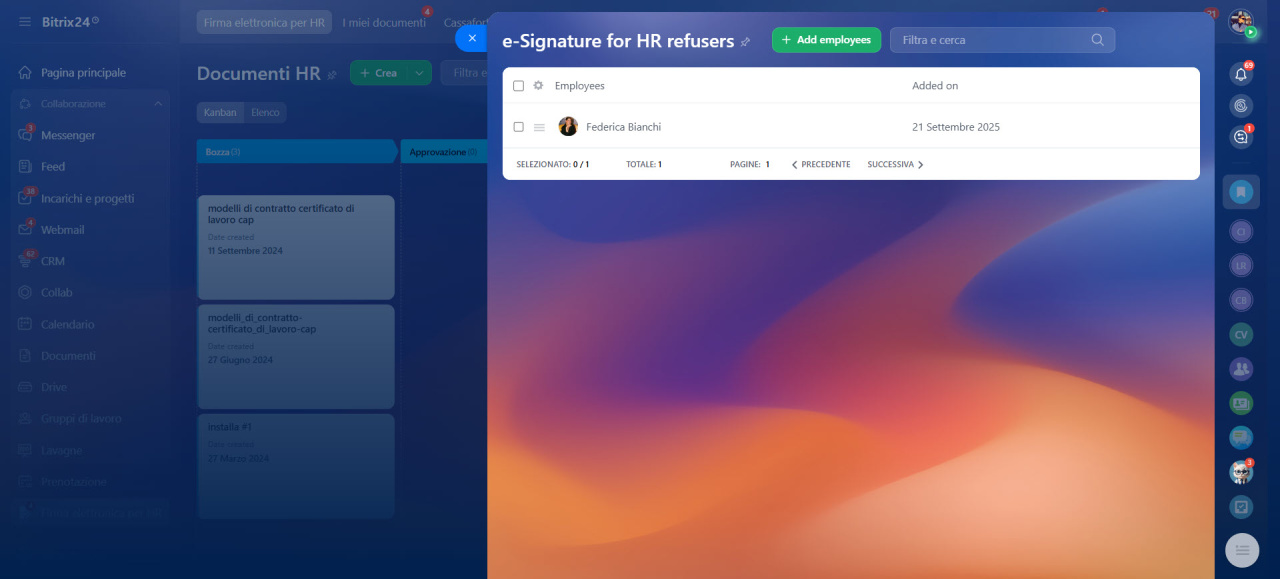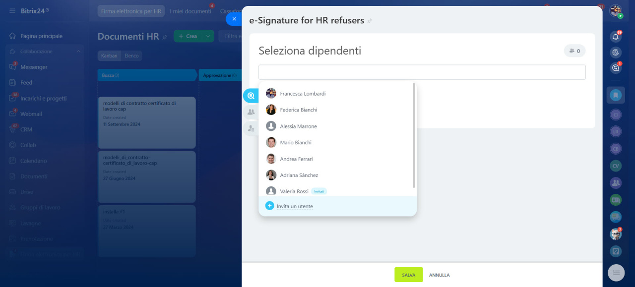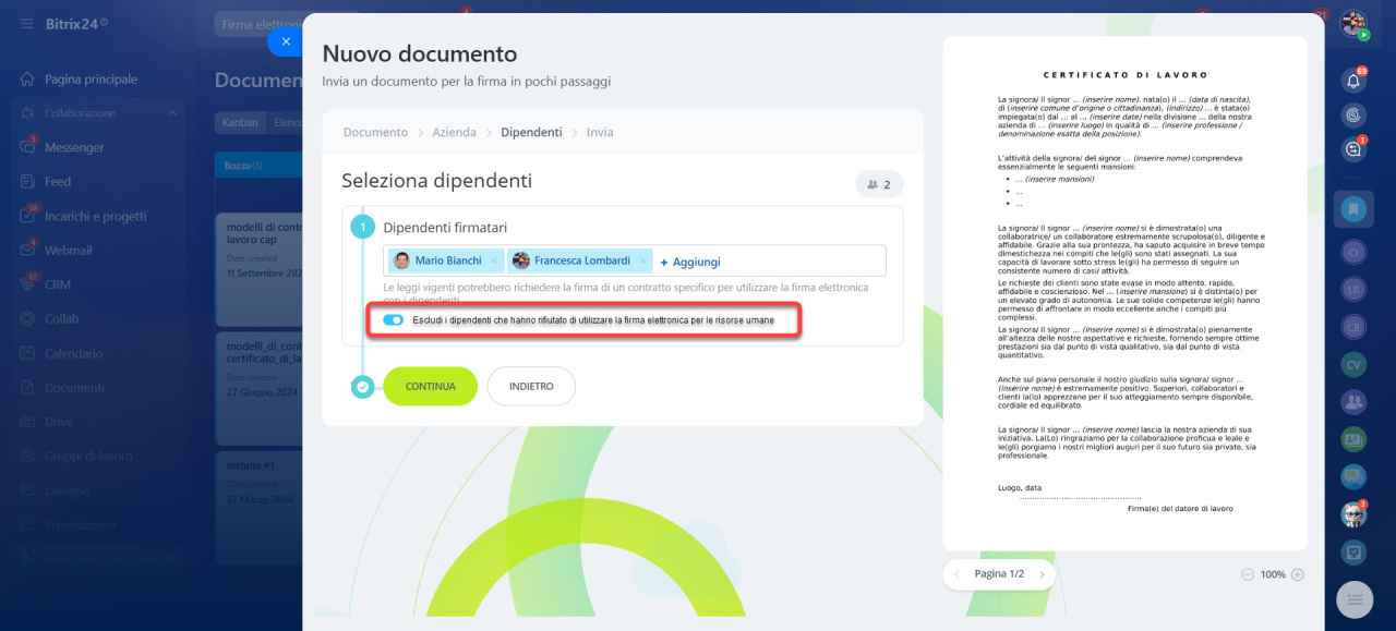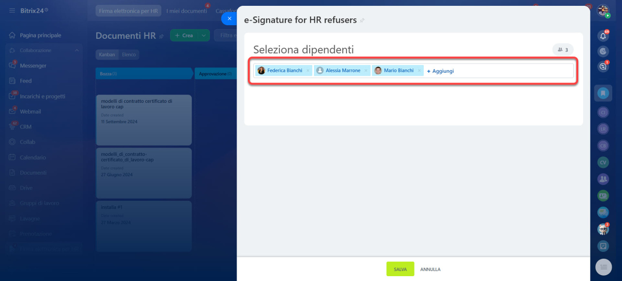 - Non è necessario controllare manualmente ogni dipendente: Bitrix24 esclude automaticamente chi ha scelto di non utilizzare la firma elettronica.