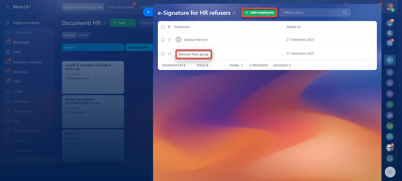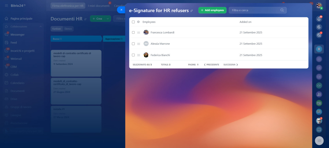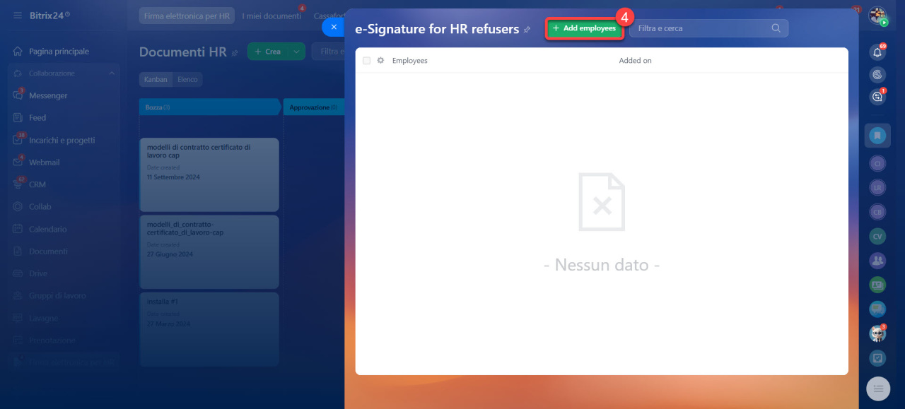 I dipendenti presenti in questo elenco non riceveranno documenti HR per la firma in Bitrix24.